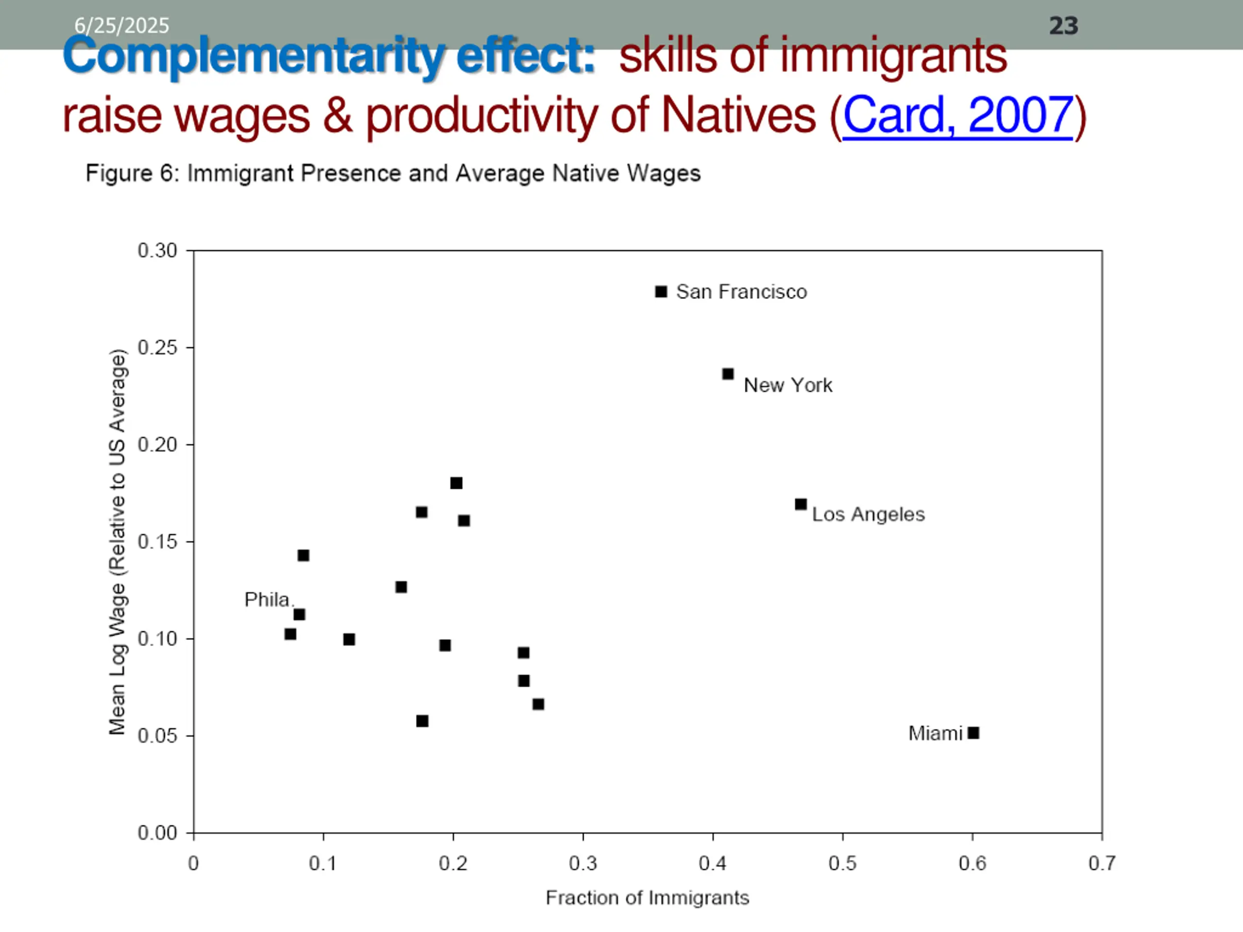 23 6/25/2025 Complementarity effect: skills of immigrants raise wages & productivity of Natives (Card, 2007) ECON/Soci 5808 Summer 2015Last lecture