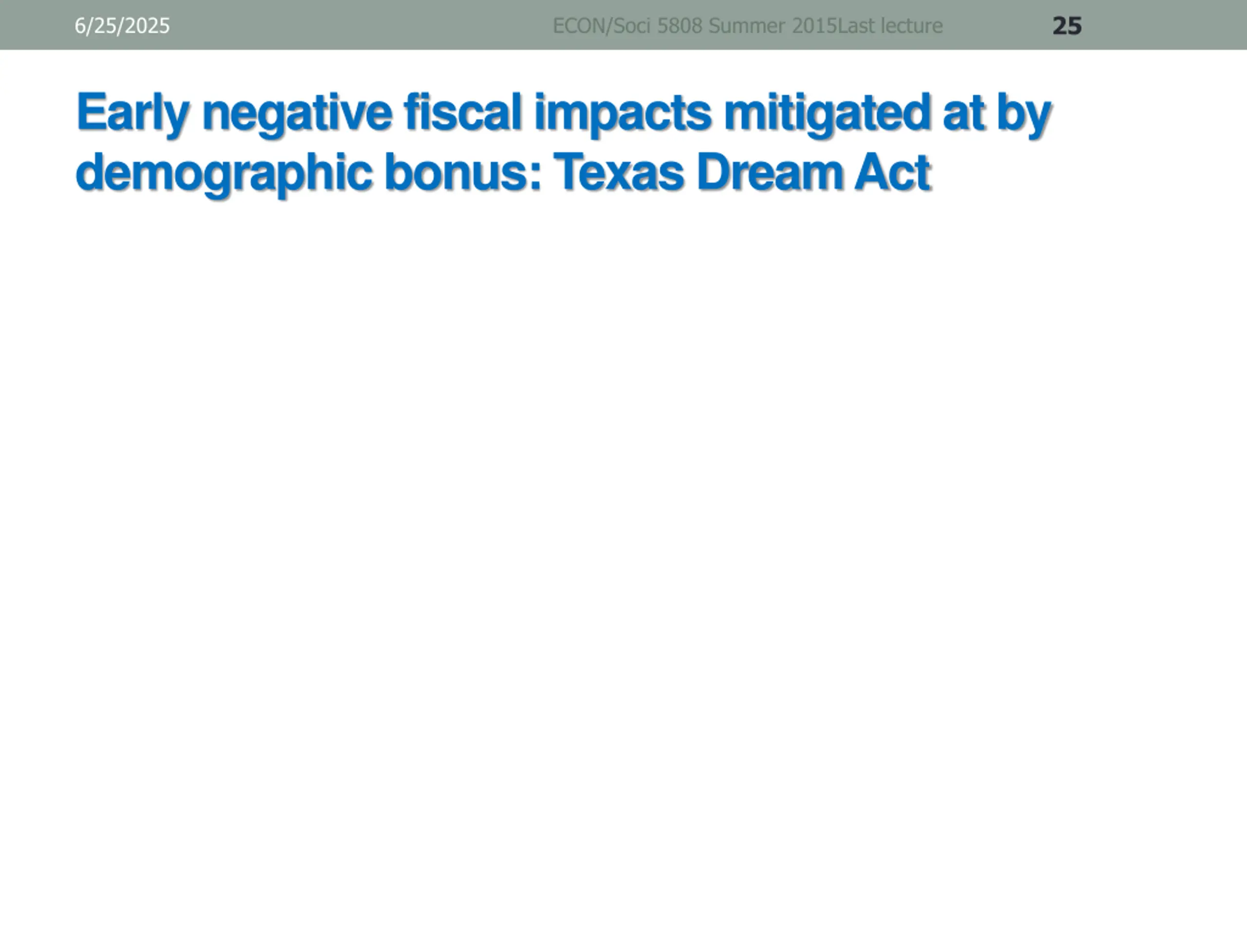 25 6/25/2025 ECON/Soci 5808 Summer 2015Last lecture Early negative fiscal impacts mitigated at by demographic bonus: Texas Dream Act