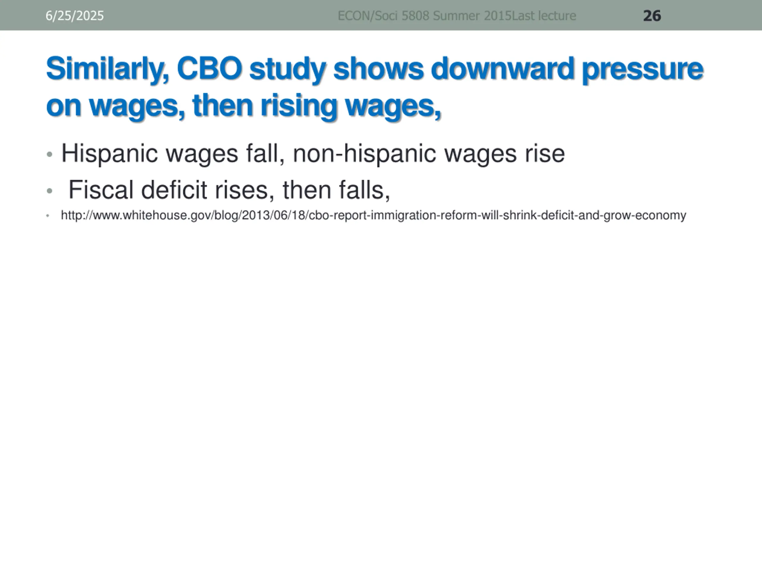 26 6/25/2025 ECON/Soci 5808 Summer 2015Last lecture Similarly, CBO study shows downward pressure on wages, then rising wages, Hispanic wages fall, non-hispanic wages rise Fiscal deficit rises, then falls, http://www.whitehouse.gov/blog/2013/06/18/cbo-report-immigration-reform-will-shrink-deficit-and-grow-economy