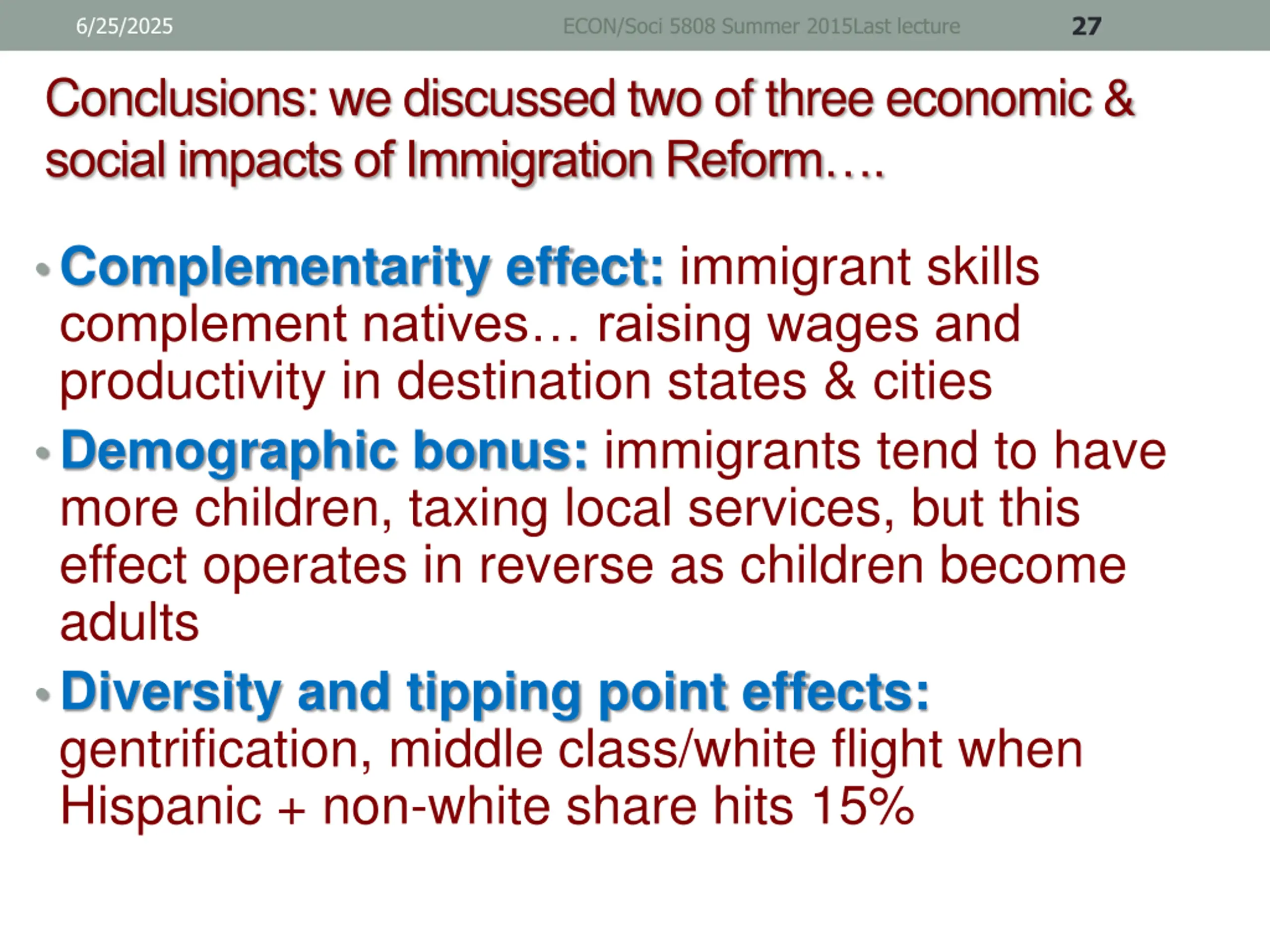 27 6/25/2025 ECON/Soci 5808 Summer 2015Last lecture Conclusions: we discussed two of three economic & social impacts of Immigration Reform . Complementarity effect: immigrant skills complement natives raising wages and productivity in destination states & cities Demographic bonus: immigrants tend to have more children, taxing local services, but this effect operates in reverse as children become adults Diversity and tipping point effects: gentrification, middle class/white flight when Hispanic + non-white share hits 15%