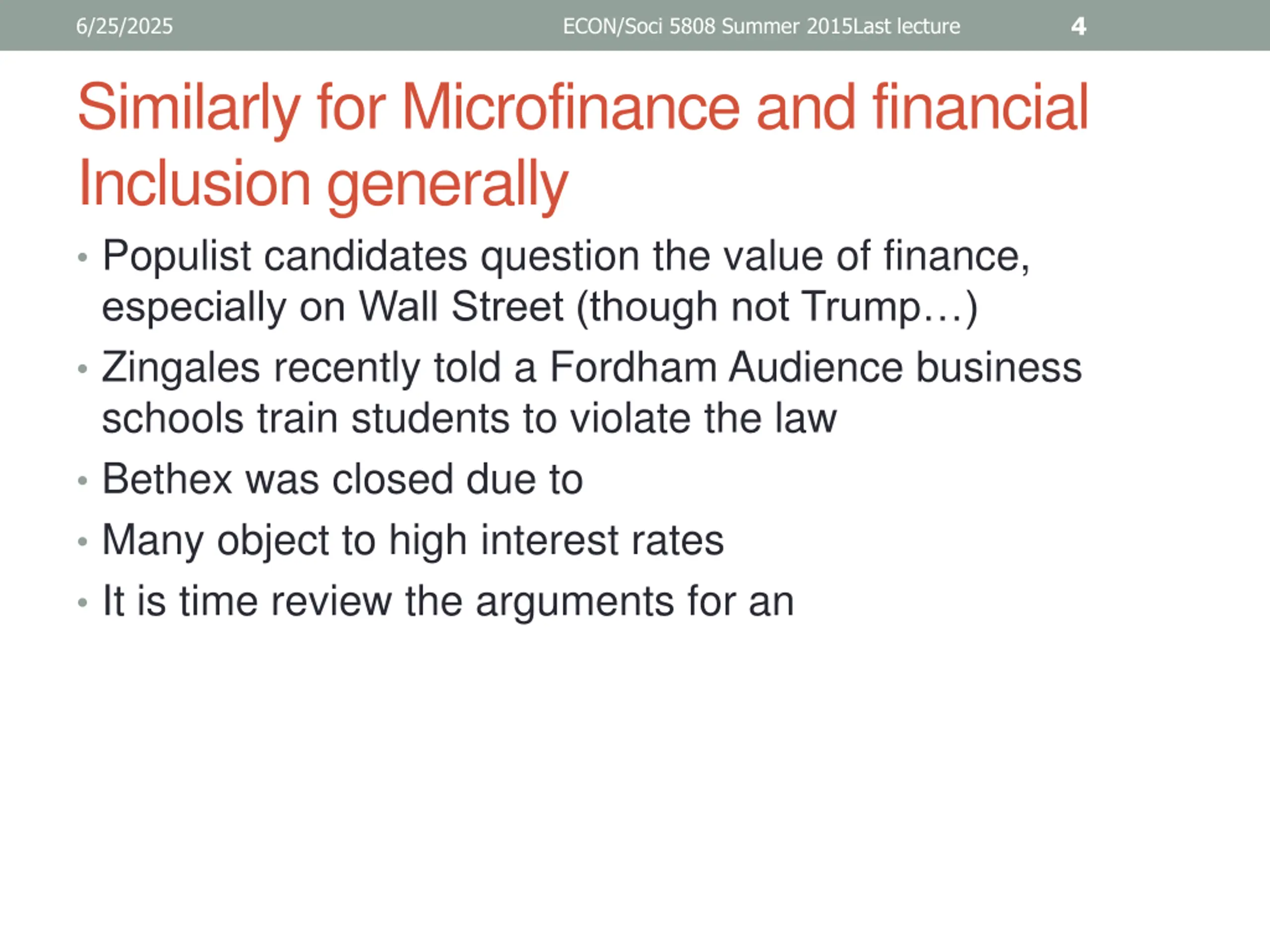 4 6/25/2025 ECON/Soci 5808 Summer 2015Last lecture Similarly for Microfinance and financial Inclusion generally Populist candidates question the value of finance, especially on Wall Street (though not Trump ) Zingales recently told a Fordham Audience business schools train students to violate the law Bethex was closed due to Many object to high interest rates It is time review the arguments for an