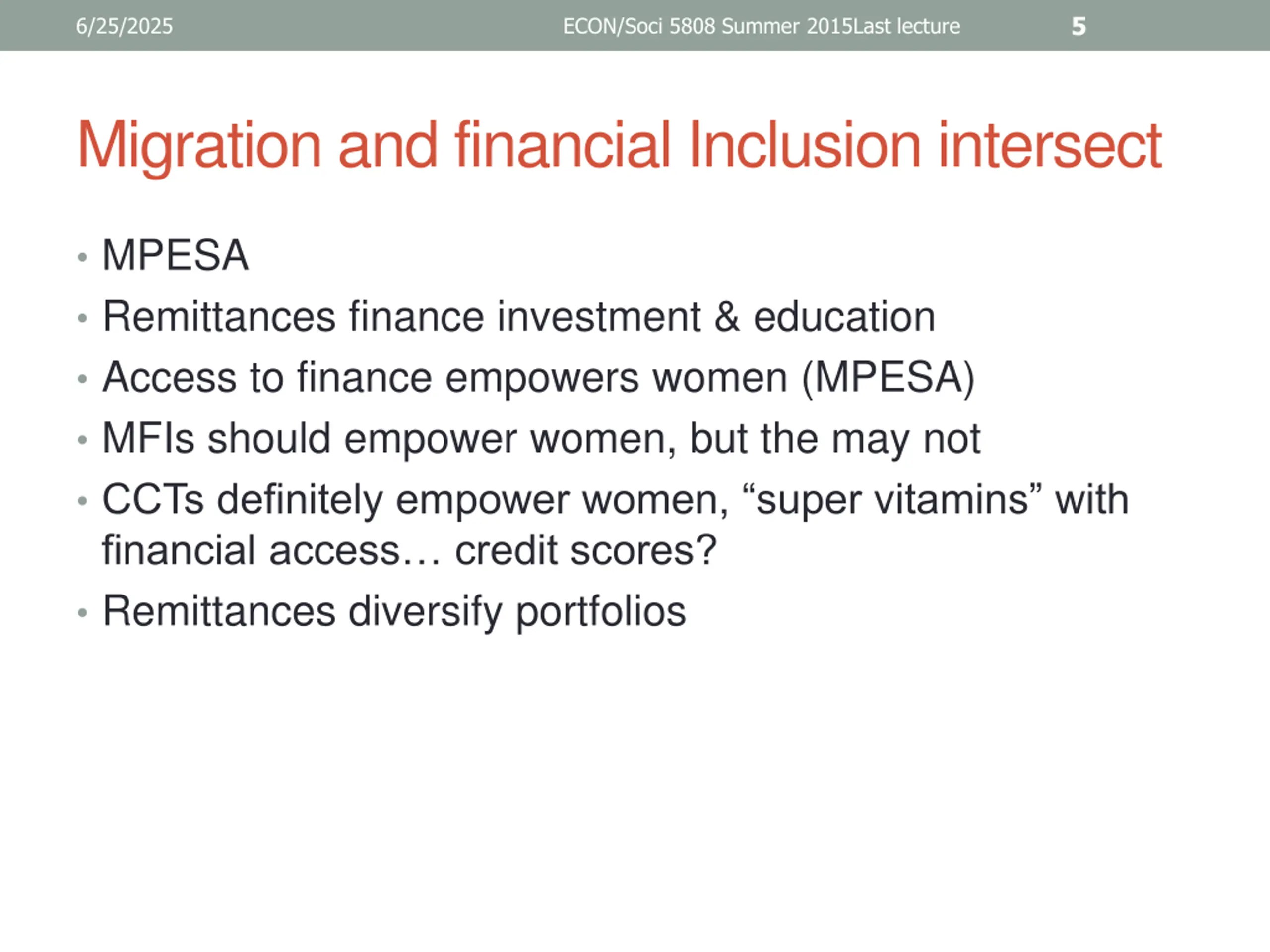 5 6/25/2025 ECON/Soci 5808 Summer 2015Last lecture Migration and financial Inclusion intersect MPESA Remittances finance investment & education Access to finance empowers women (MPESA) MFIs should empower women, but the may not CCTs definitely empower women, super vitamins with financial access credit scores? Remittances diversify portfolios