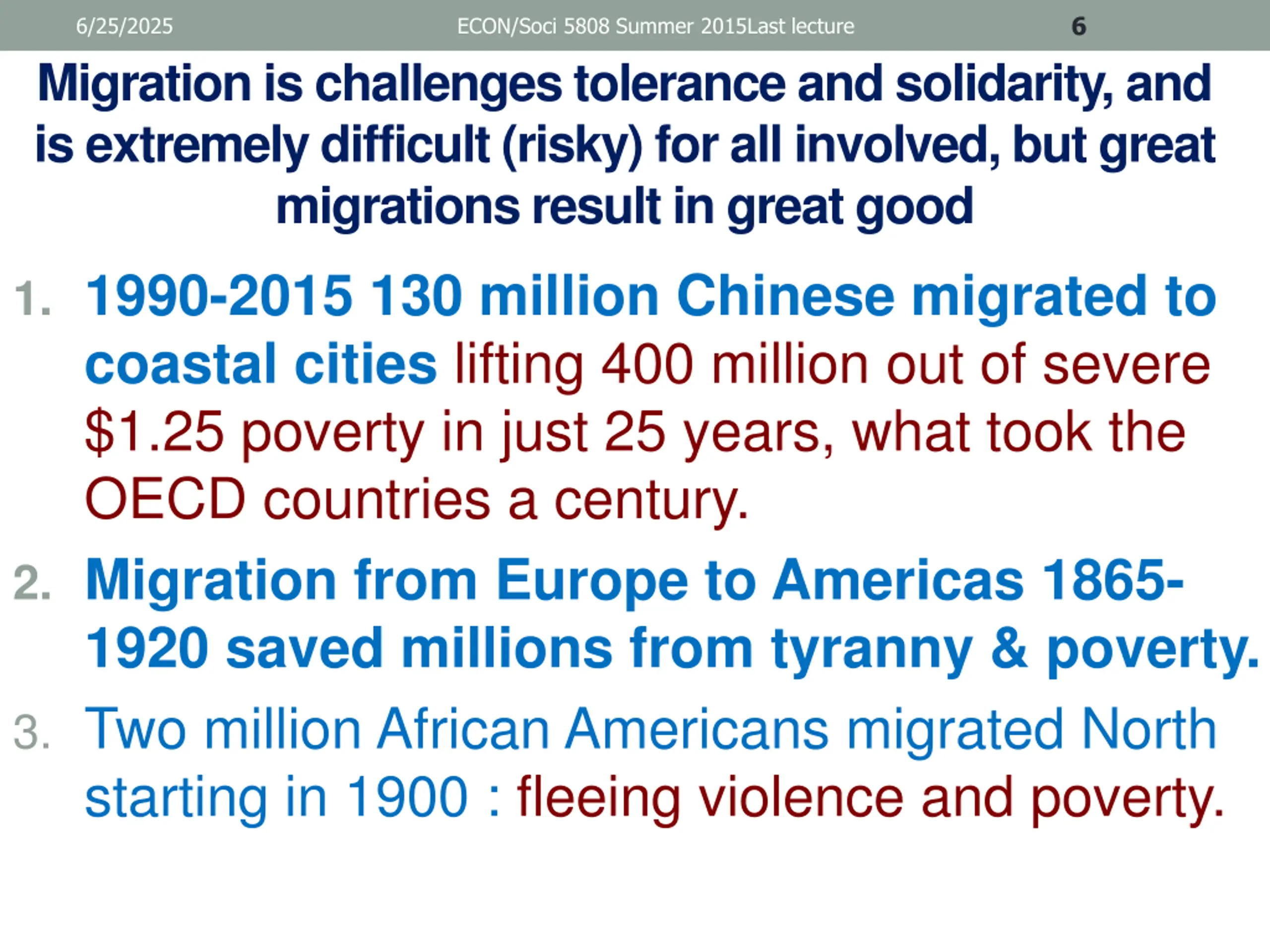 6 6/25/2025 ECON/Soci 5808 Summer 2015Last lecture Migration is challenges tolerance and solidarity, and is extremely difficult (risky) for all involved, but great migrations result in great good 1. 1990-2015 130 million Chinese migrated to coastal cities lifting 400 million out of severe $1.25 poverty in just 25 years, what took the OECD countries a century. 2. Migration from Europe to Americas 1865- 1920 saved millions from tyranny & poverty. 3. Two million African Americans migrated North starting in 1900 : fleeing violence and poverty.