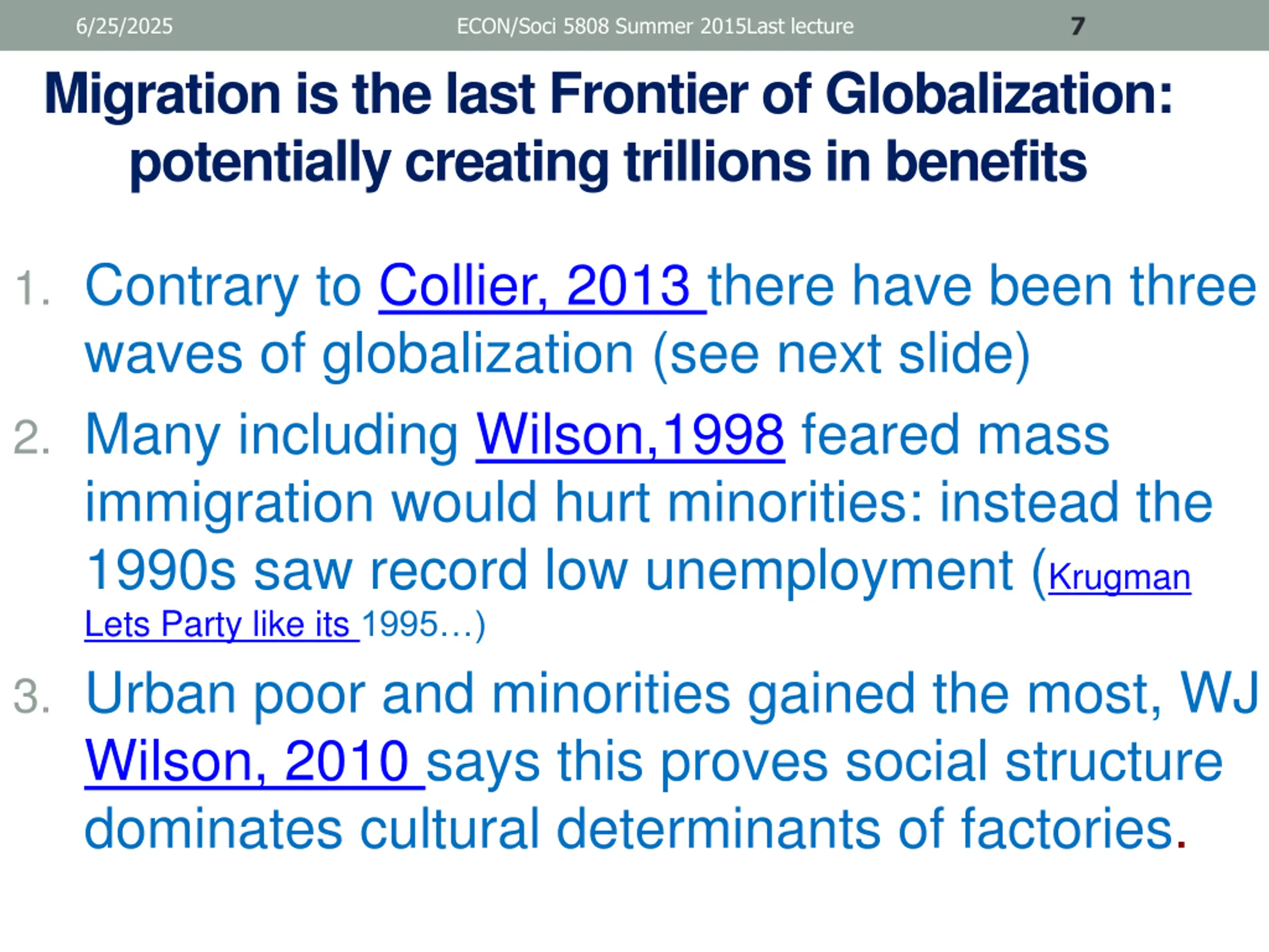 7 6/25/2025 ECON/Soci 5808 Summer 2015Last lecture Migration is the last Frontier of Globalization: potentially creating trillions in benefits 1. Contrary to Collier, 2013 there have been three waves of globalization (see next slide) 2. Many including Wilson,1998 feared mass immigration would hurt minorities: instead the 1990s saw record low unemployment (Krugman Lets Party like its 1995 ) 3. Urban poor and minorities gained the most, WJ Wilson, 2010 says this proves social structure dominates cultural determinants of factories.