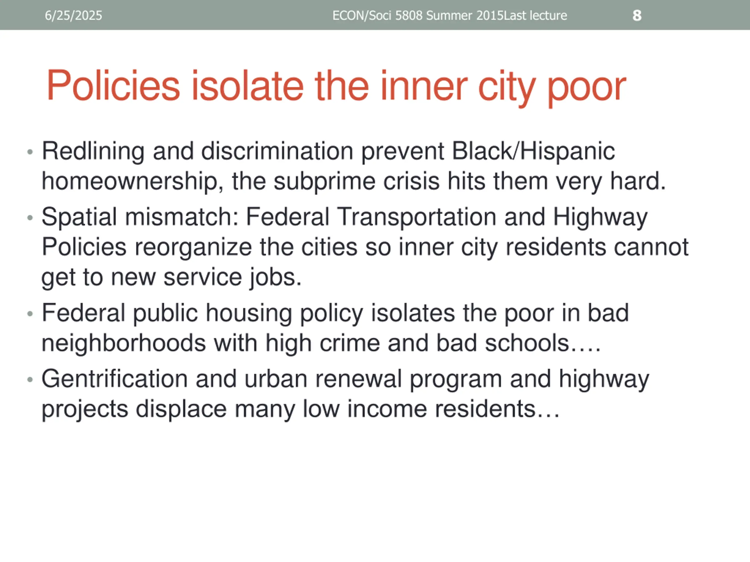 8 6/25/2025 ECON/Soci 5808 Summer 2015Last lecture Policies isolate the inner city poor Redlining and discrimination prevent Black/Hispanic homeownership, the subprime crisis hits them very hard. Spatial mismatch: Federal Transportation and Highway Policies reorganize the cities so inner city residents cannot get to new service jobs. Federal public housing policy isolates the poor in bad neighborhoods with high crime and bad schools . Gentrification and urban renewal program and highway projects displace many low income residents
