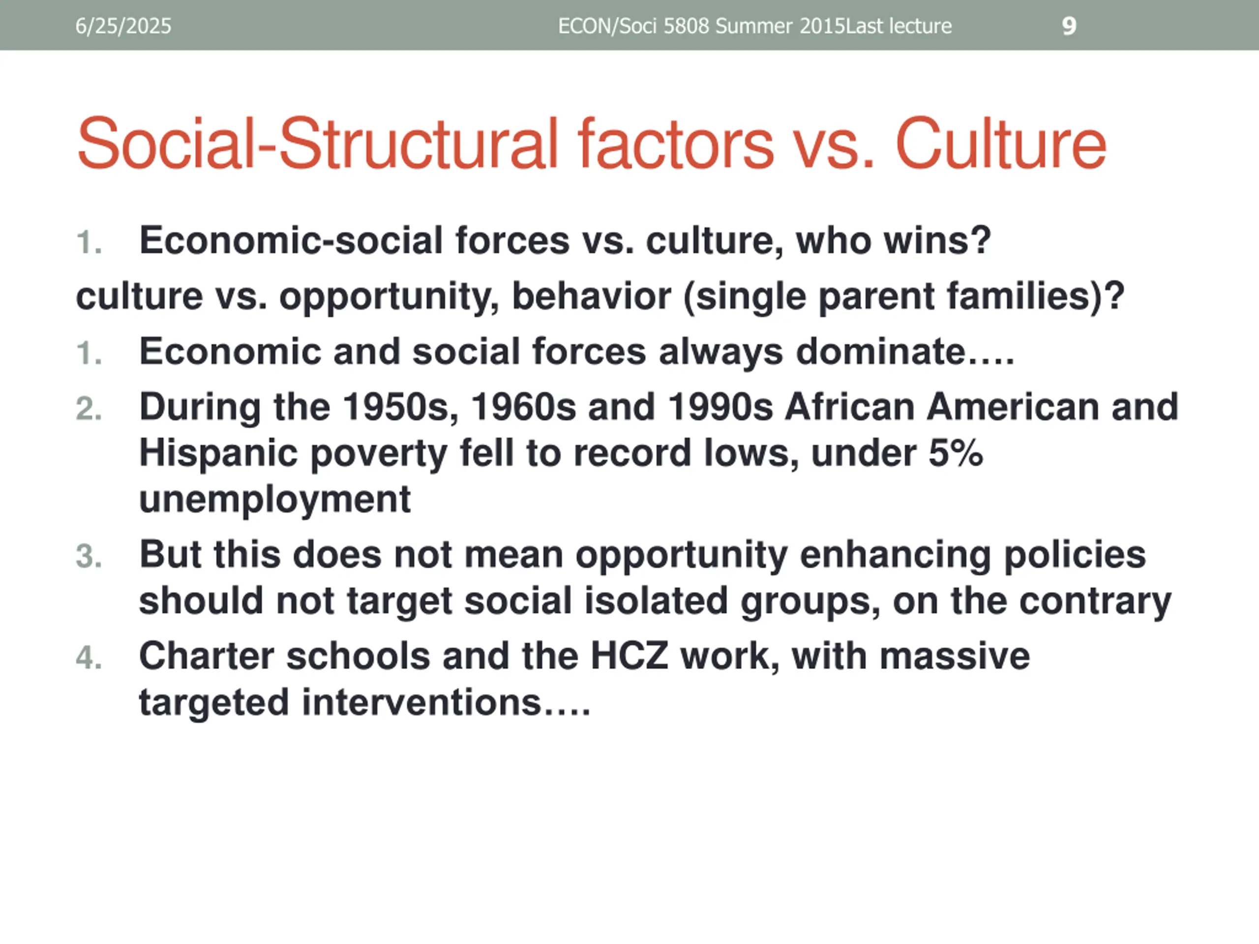 9 6/25/2025 ECON/Soci 5808 Summer 2015Last lecture Social-Structural factors vs. Culture Economic-social forces vs. culture, who wins? 1. culture vs. opportunity, behavior (single parent families)? 1. Economic and social forces always dominate . 2. During the 1950s, 1960s and 1990s African American and Hispanic poverty fell to record lows, under 5% unemployment 3. But this does not mean opportunity enhancing policies should not target social isolated groups, on the contrary 4. Charter schools and the HCZ work, with massive targeted interventions .