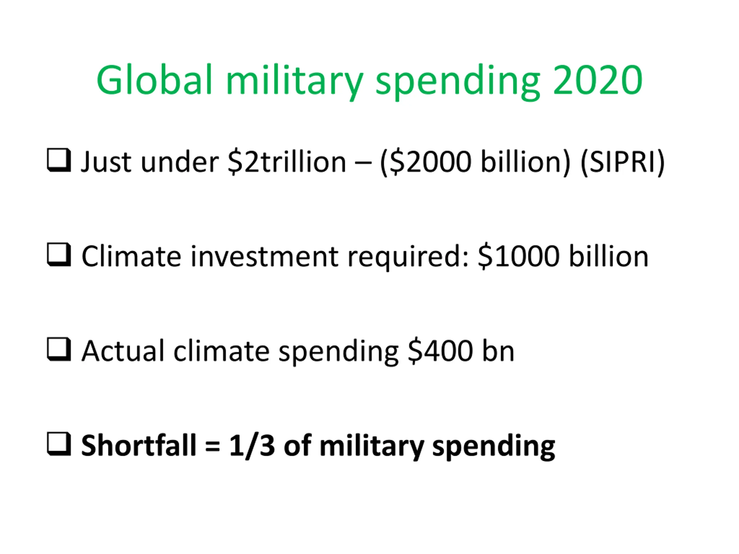 Global military spending 2020 Just under $2trillion ($2000 billion) (SIPRI) Climate investment required: $1000 billion Actual climate spending $400 bn Shortfall = 1/3 of military spending
