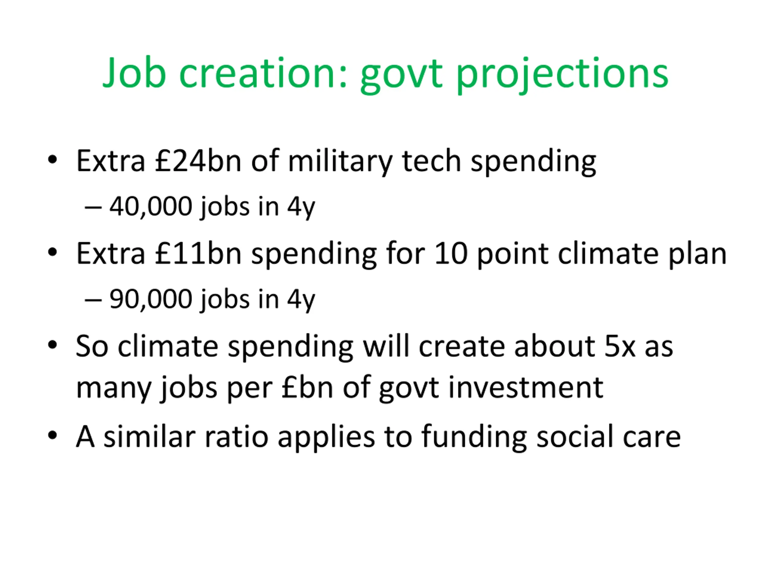 Job creation: govt projections Extra 24bn of military tech spending 40,000 jobs in 4y Extra 11bn spending for 10 point climate plan 90,000 jobs in 4y So climate spending will create about 5x as many jobs per bn of govt investment A similar ratio applies to funding social care