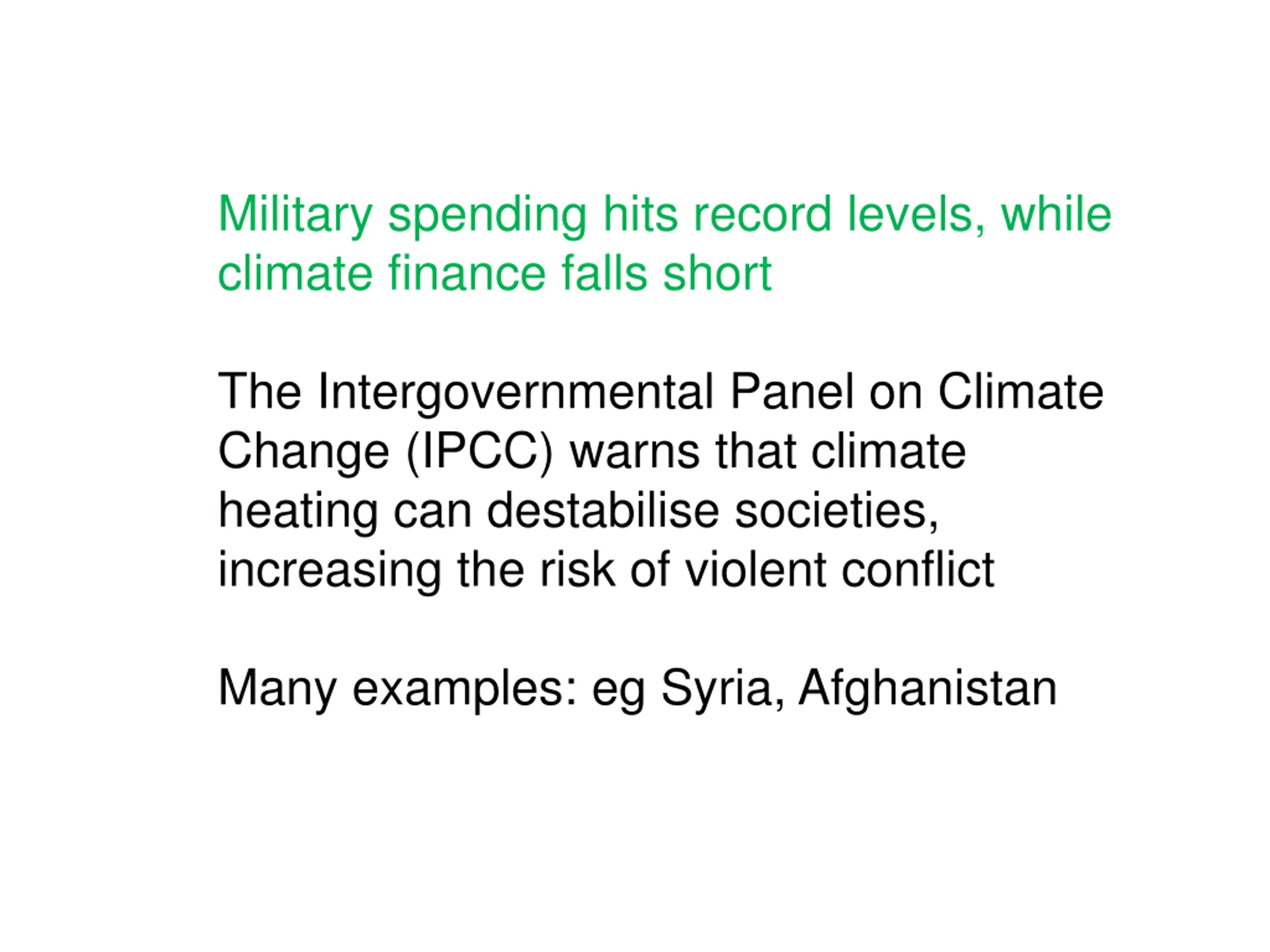 Military spending hits record levels, while climate finance falls short The Intergovernmental Panel on Climate Change (IPCC) warns that climate heating can destabilise societies, increasing the risk of violent conflict Many examples: eg Syria, Afghanistan