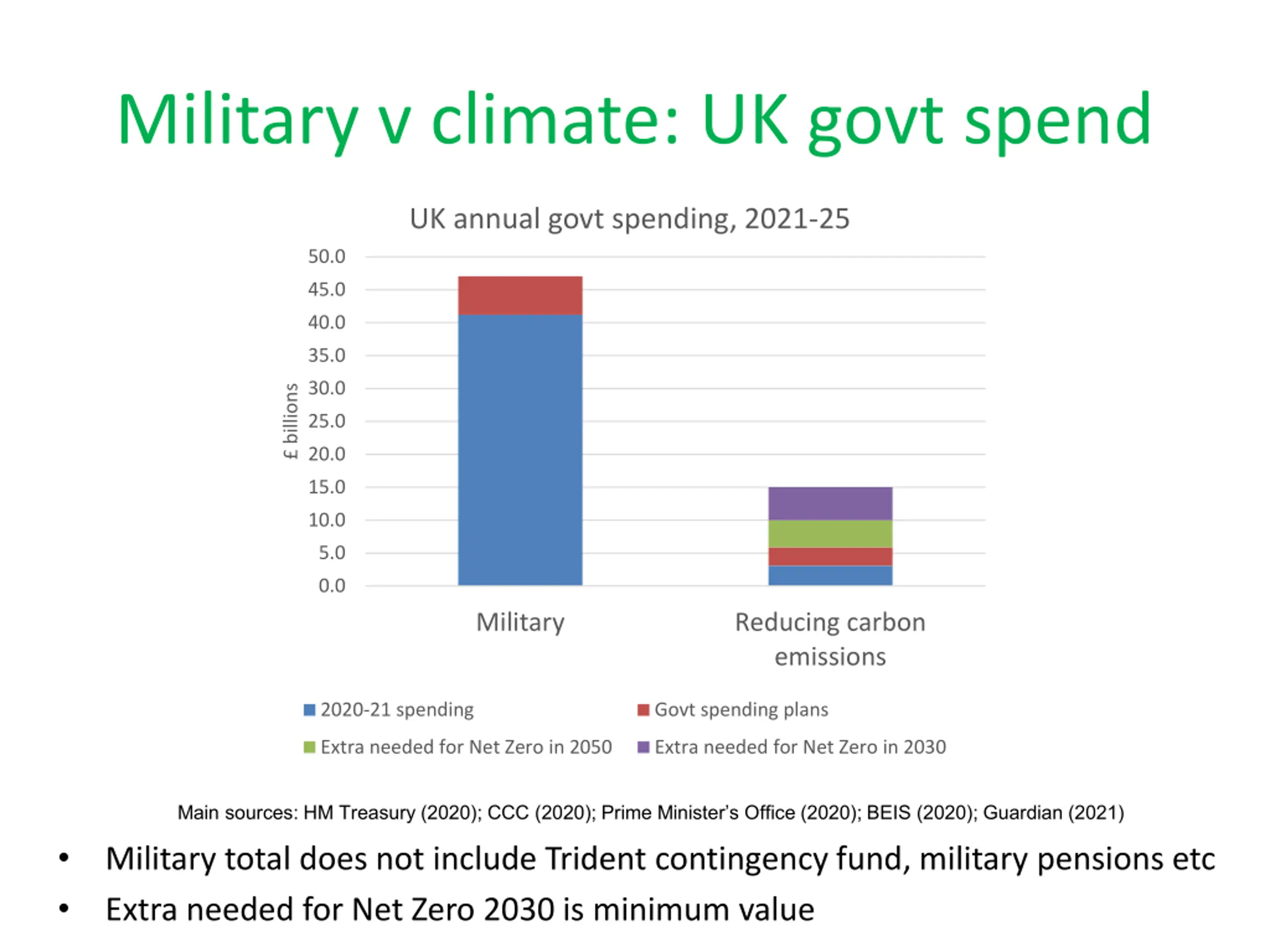 UK govt has chosen Extra 6bn per year on Deploying aircraft carrier group to South China Sea Playing leading role in robot arms race Exporting weapons to fossil fuel dictatorships Deploying nuclear weapons, creating risk of accidental catastrophic nuclear war & nuclear winter Failing to tackle climate emergency, fuelling rise in instability and war rather than extra 7bn per year/ 12bn+ per year on hitting 2050/ 2030 net zero climate target