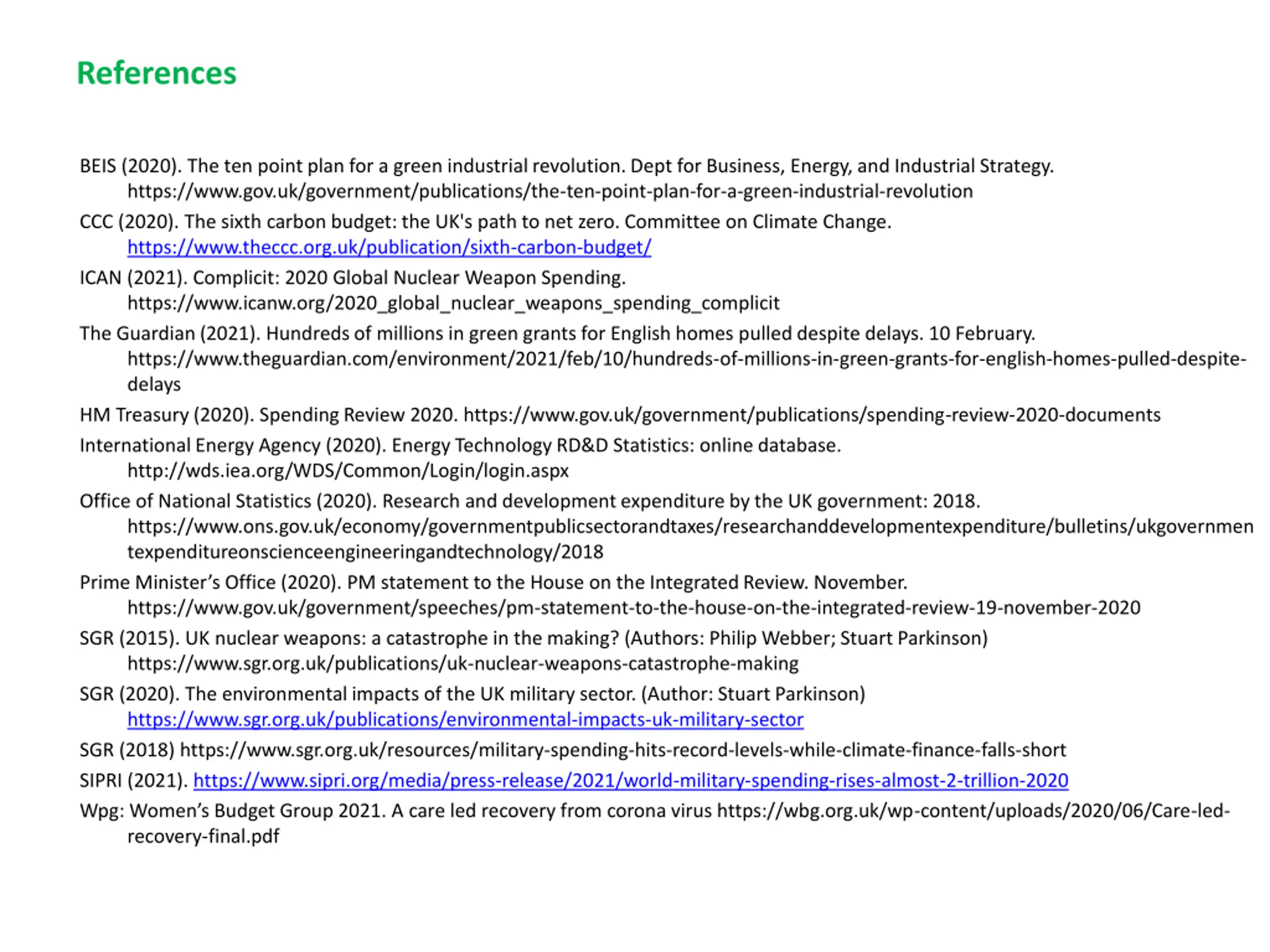 References BEIS (2020). The ten point plan for a green industrial revolution. Dept for Business, Energy, and Industrial Strategy. https://www.gov.uk/government/publications/the-ten-point-plan-for-a-green-industrial-revolution CCC (2020). The sixth carbon budget: the UK's path to net zero. Committee on Climate Change. https://www.theccc.org.uk/publication/sixth-carbon-budget/ ICAN (2021). Complicit: 2020 Global Nuclear Weapon Spending. https://www.icanw.org/2020_global_nuclear_weapons_spending_complicit The Guardian (2021). Hundreds of millions in green grants for English homes pulled despite delays. 10 February. https://www.theguardian.com/environment/2021/feb/10/hundreds-of-millions-in-green-grants-for-english-homes-pulled-despite- delays HM Treasury (2020). Spending Review 2020. https://www.gov.uk/government/publications/spending-review-2020-documents International Energy Agency (2020). Energy Technology RD&D Statistics: online database. http://wds.iea.org/WDS/Common/Login/login.aspx Office of National Statistics (2020). Research and development expenditure by the UK government: 2018. https://www.ons.gov.uk/economy/governmentpublicsectorandtaxes/researchanddevelopmentexpenditure/bulletins/ukgovernmen texpenditureonscienceengineeringandtechnology/2018 Prime Minister s Office (2020). PM statement to the House on the Integrated Review. November. https://www.gov.uk/government/speeches/pm-statement-to-the-house-on-the-integrated-review-19-november-2020 SGR (2015). UK nuclear weapons: a catastrophe in the making? (Authors: Philip Webber; Stuart Parkinson) https://www.sgr.org.uk/publications/uk-nuclear-weapons-catastrophe-making SGR (2020). The environmental impacts of the UK military sector. (Author: Stuart Parkinson) https://www.sgr.org.uk/publications/environmental-impacts-uk-military-sector SGR (2018) https://www.sgr.org.uk/resources/military-spending-hits-record-levels-while-climate-finance-falls-short SIPRI (2021). https://www.sipri.org/media/press-release/2021/world-military-spending-rises-almost-2-trillion-2020 Wpg: Women s Budget Group 2021. A care led recovery from corona virus https://wbg.org.uk/wp-content/uploads/2020/06/Care-led- recovery-final.pdf