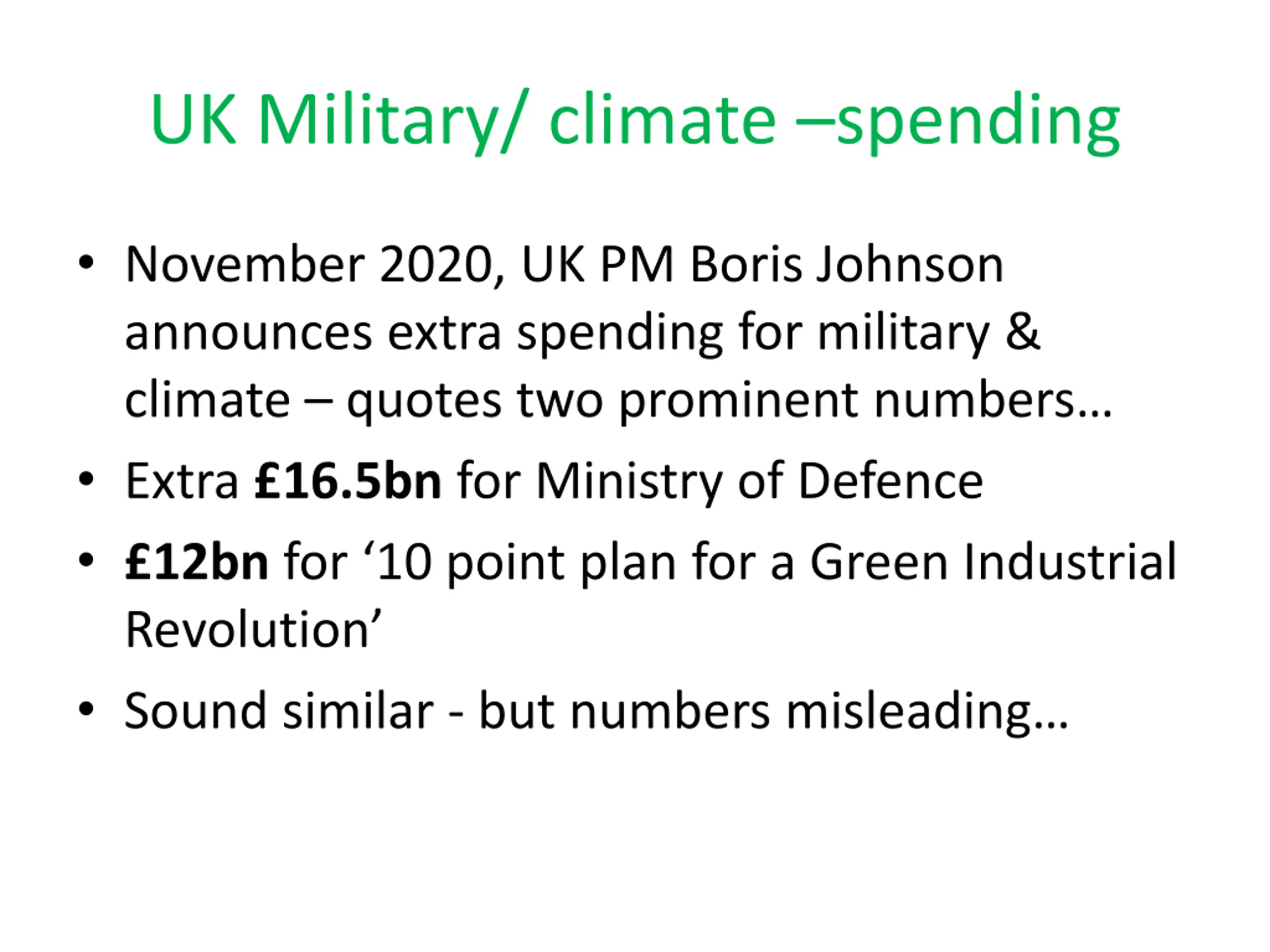 UK Military/ climate spending November 2020, UK PM Boris Johnson announces extra spending for military & climate quotes two prominent numbers Extra 16.5bn for Ministry of Defence 12bnfor 10 point plan for a Green Industrial Revolution Sound similar - but numbers misleading