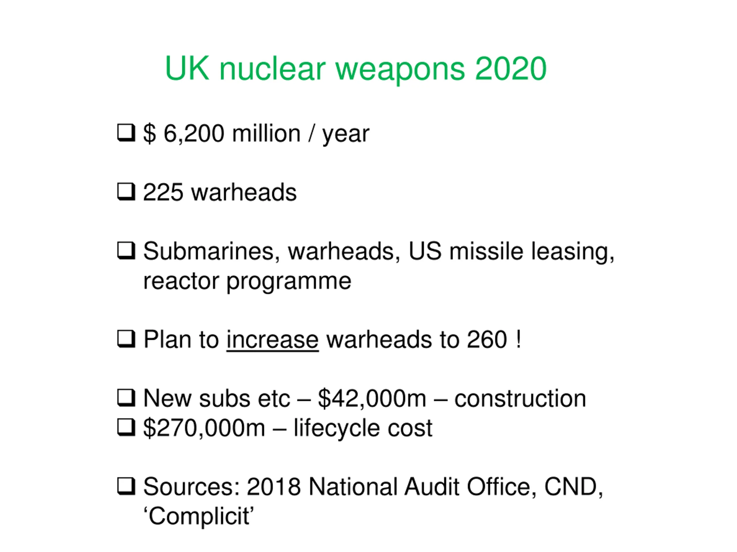 UK nuclear weapons 2020 $ 6,200 million / year 225 warheads Submarines, warheads, US missile leasing, reactor programme Plan to increase warheads to 260 ! New subs etc $42,000m construction $270,000m lifecycle cost Sources: 2018 National Audit Office, CND, Complicit
