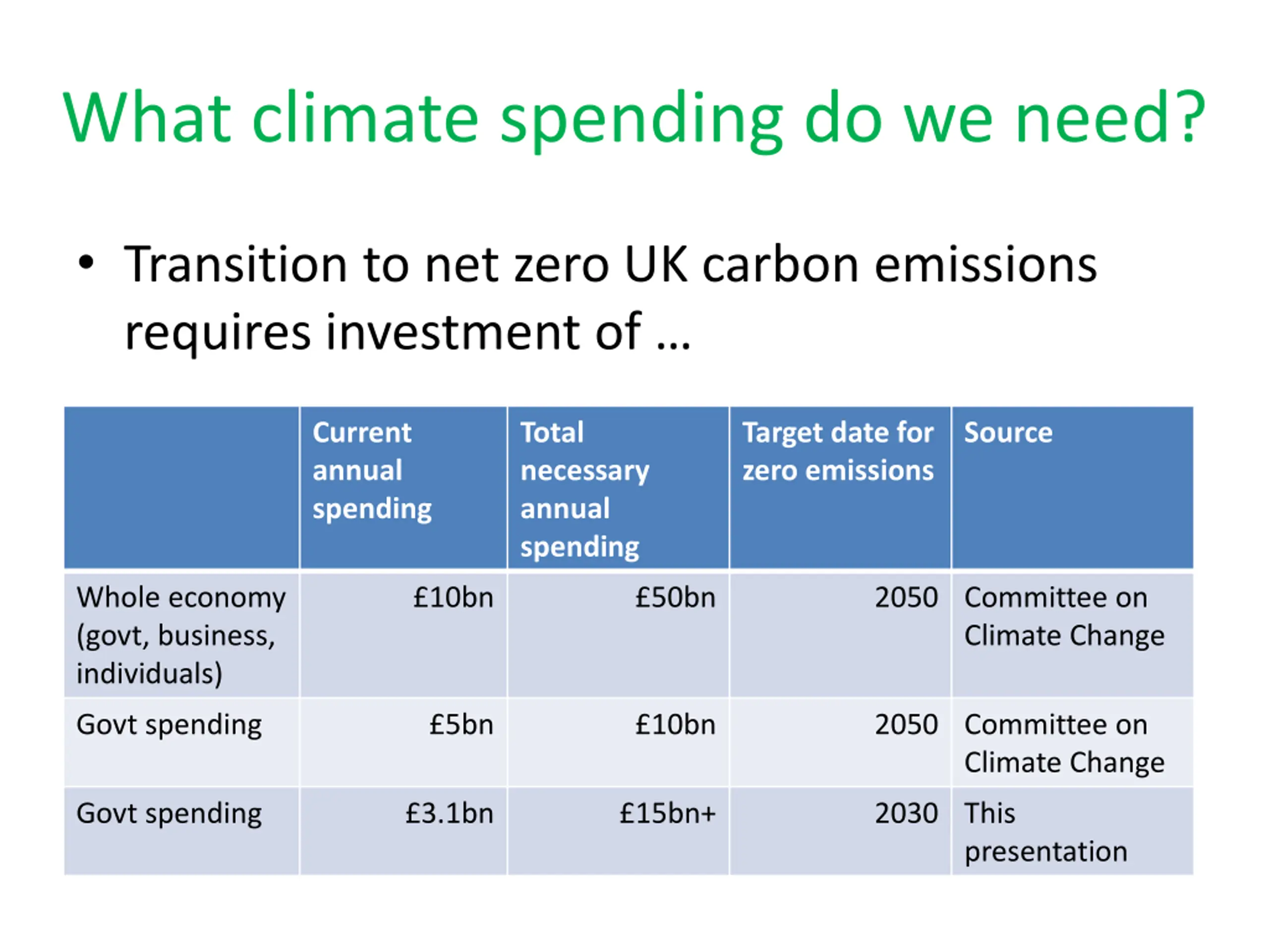 What climate spending do we need? Transition to net zero UK carbon emissions requires investment of Current annual spending Total necessary annual spending Target date for zero emissions Source Whole economy (govt, business, individuals) 10bn 50bn 2050 Committee on Climate Change Govt spending 5bn 10bn 2050 Committee on Climate Change Govt spending 3.1bn 15bn+ 2030 This presentation