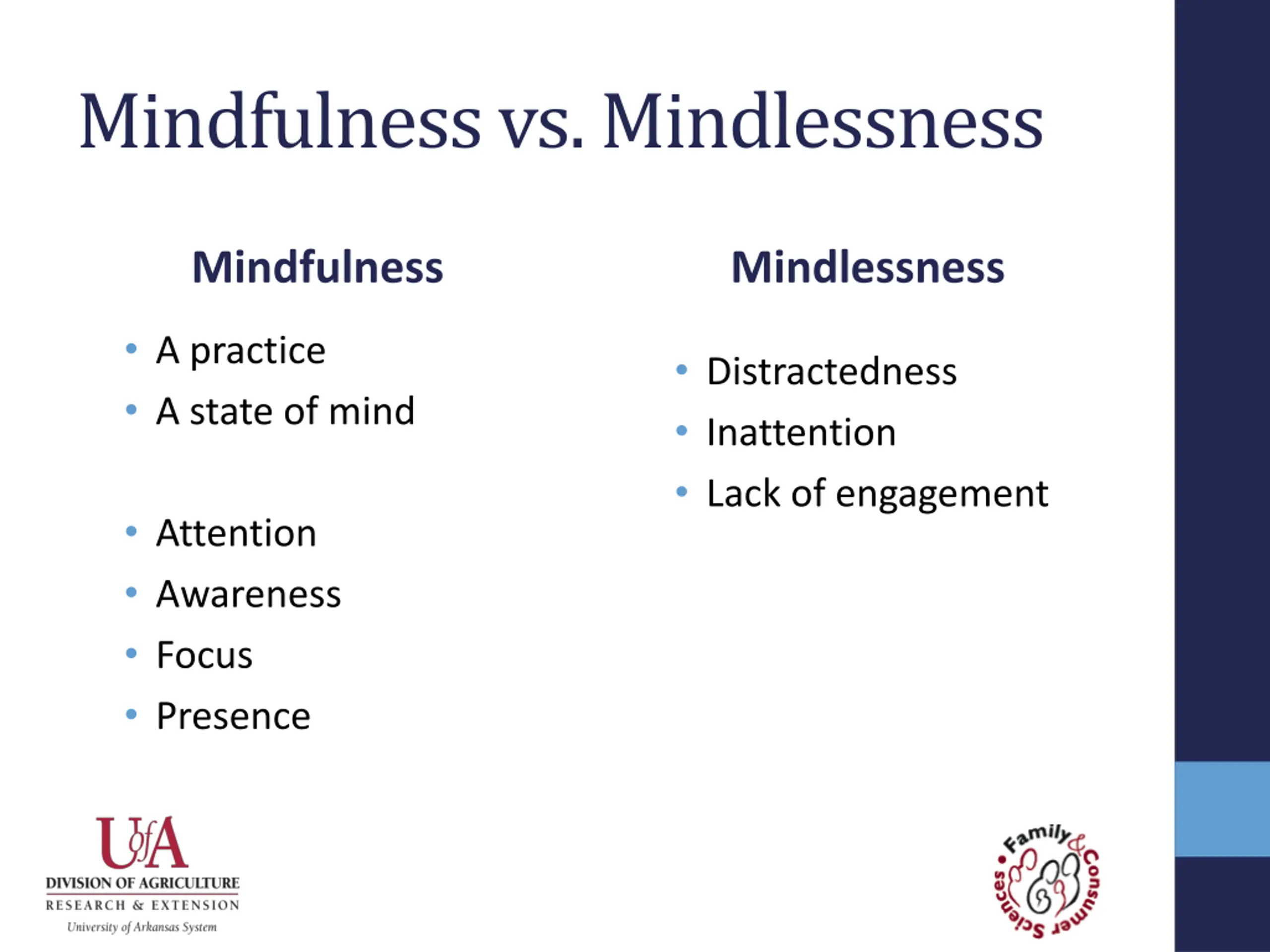 Mindfulness vs. Mindlessness Mindfulness Mindlessness A practice A state of mind Distractedness Inattention Lack of engagement Attention Awareness Focus Presence