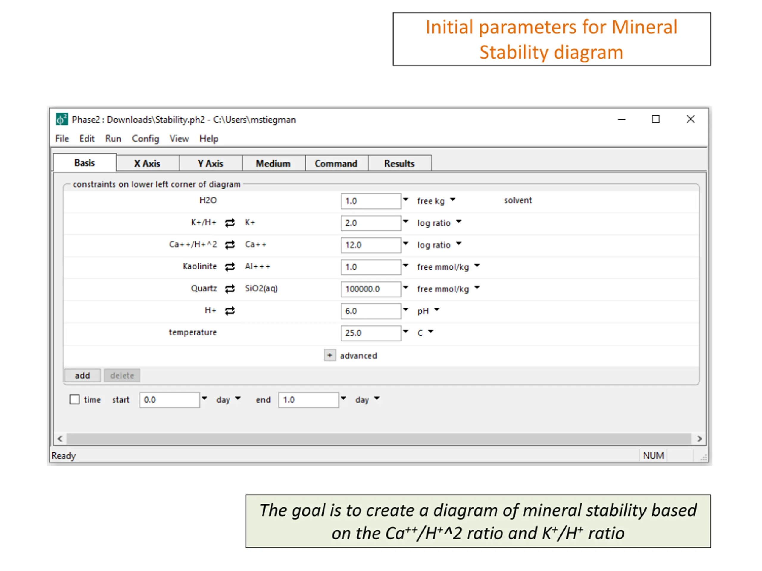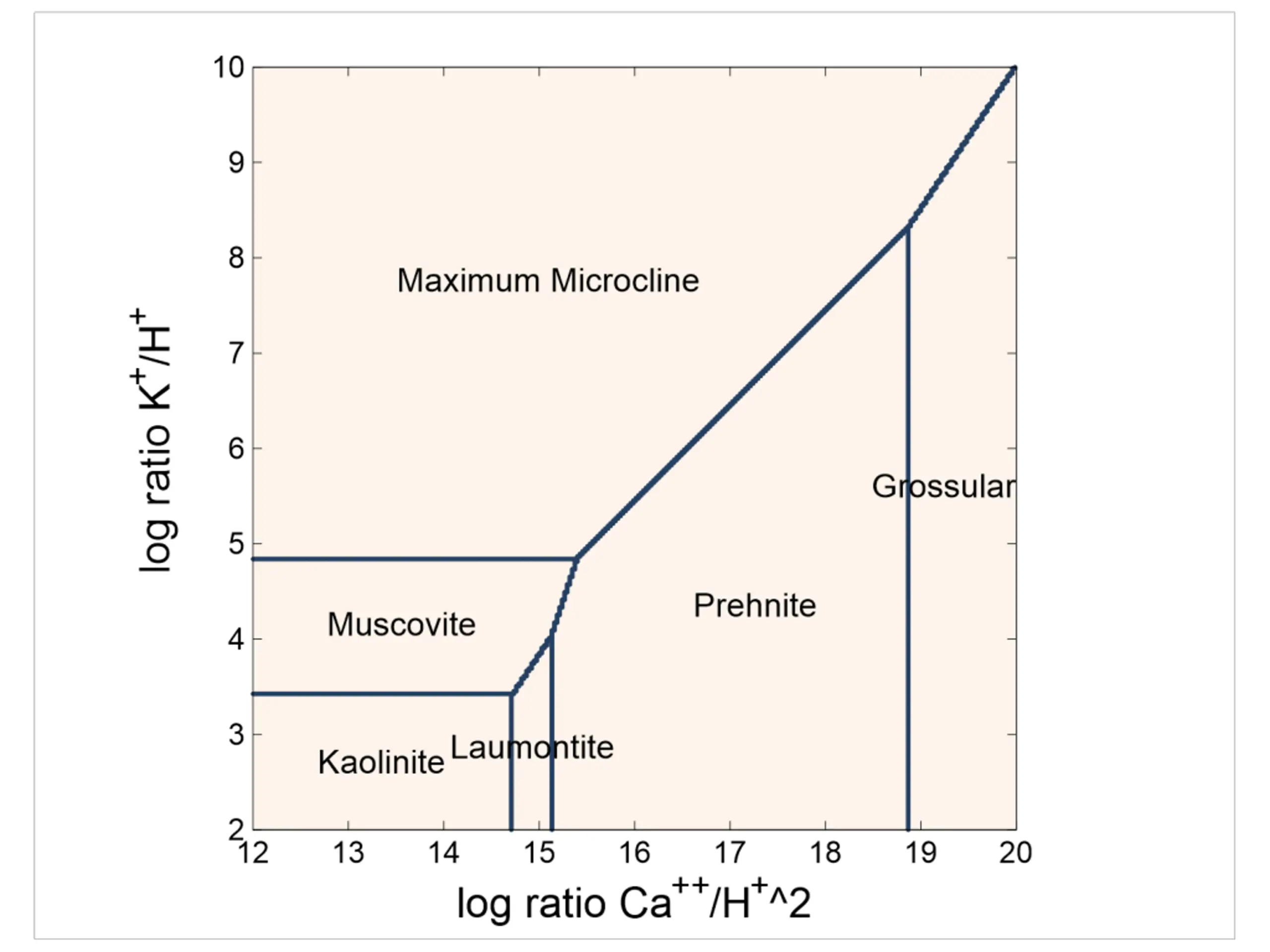 Initial parameters for Mineral Stability diagram The goal is to create a diagram of mineral stability based on the Ca++/H+^2 ratio and K+/H+ ratio