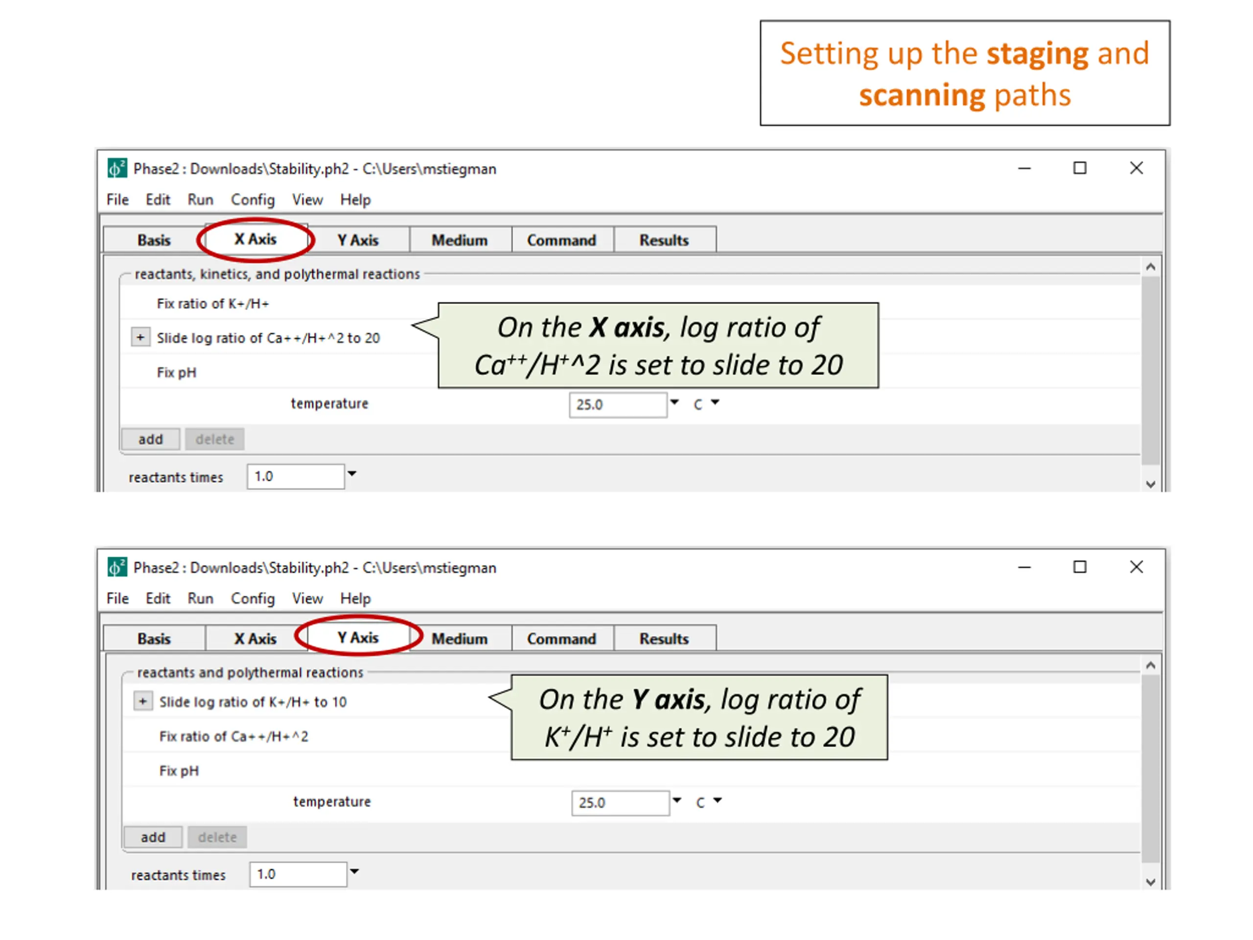 Setting up the staging and scanning paths On the X axis, log ratio of Ca++/H+^2 is set to slide to 20 On the Y axis, log ratio of K+/H+ is set to slide to 20