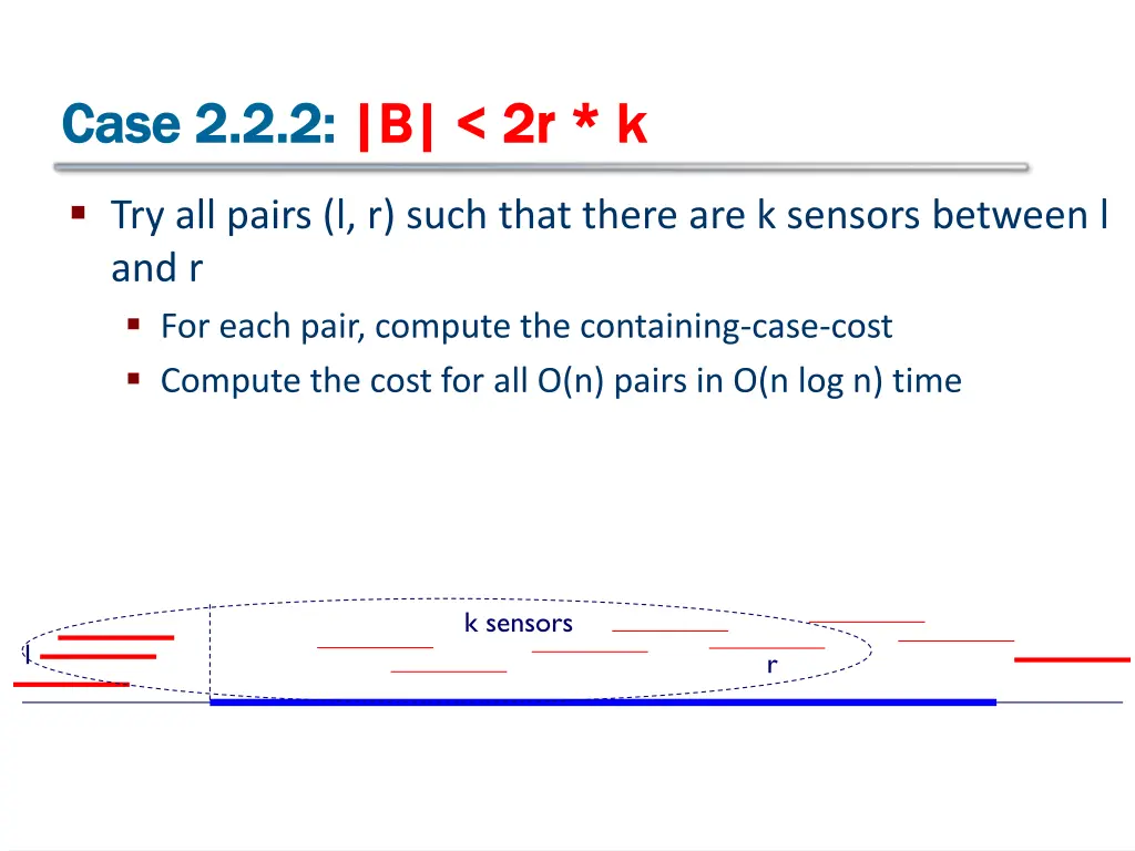 Case 2.2.2: Case 2.2.2: |B| < 2r * k |B| < 2r * k Try all pairs (l, r) such that there are k sensors between l and r For each pair, compute the containing-case-cost Compute the cost for all O(n) pairs in O(n log n) time k sensors l r