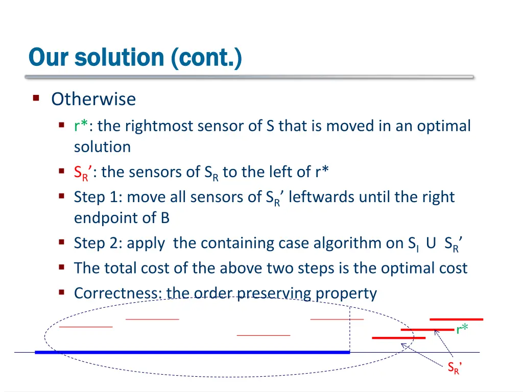 Our solution (cont.) Our solution (cont.) Otherwise r*: the rightmost sensor of S that is moved in an optimal solution SR : the sensors of SRto the left of r* Step 1: move all sensors of SR leftwards until the right endpoint of B Step 2: apply the containing case algorithm on SI U SR The total cost of the above two steps is the optimal cost Correctness: the order preserving property r* SR