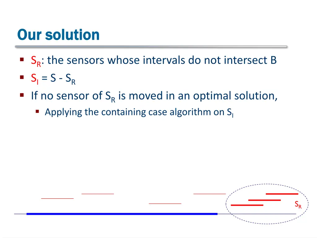 Our solution Our solution SR: the sensors whose intervals do not intersect B SI= S - SR If no sensor of SRis moved in an optimal solution, Applying the containing case algorithm on SI SR
