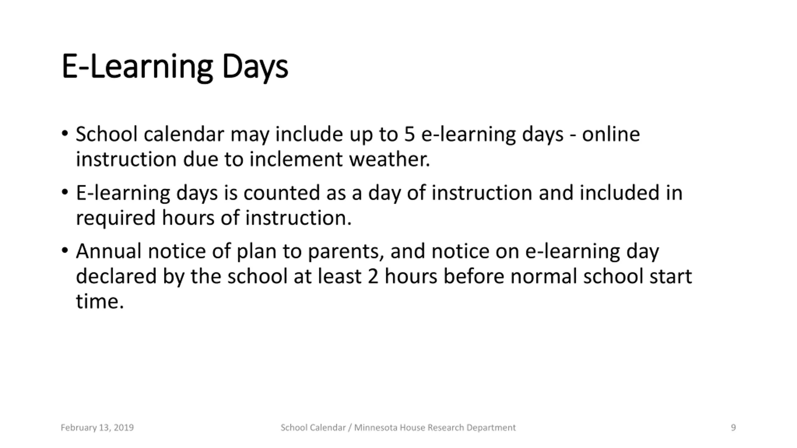 E E- -Learning Days Learning Days School calendar may include up to 5 e-learning days - online instruction due to inclement weather. E-learning days is counted as a day of instruction and included in required hours of instruction. Annual notice of plan to parents, and notice on e-learning day declared by the school at least 2 hours before normal school start time. February 13, 2019 School Calendar / Minnesota House Research Department 9