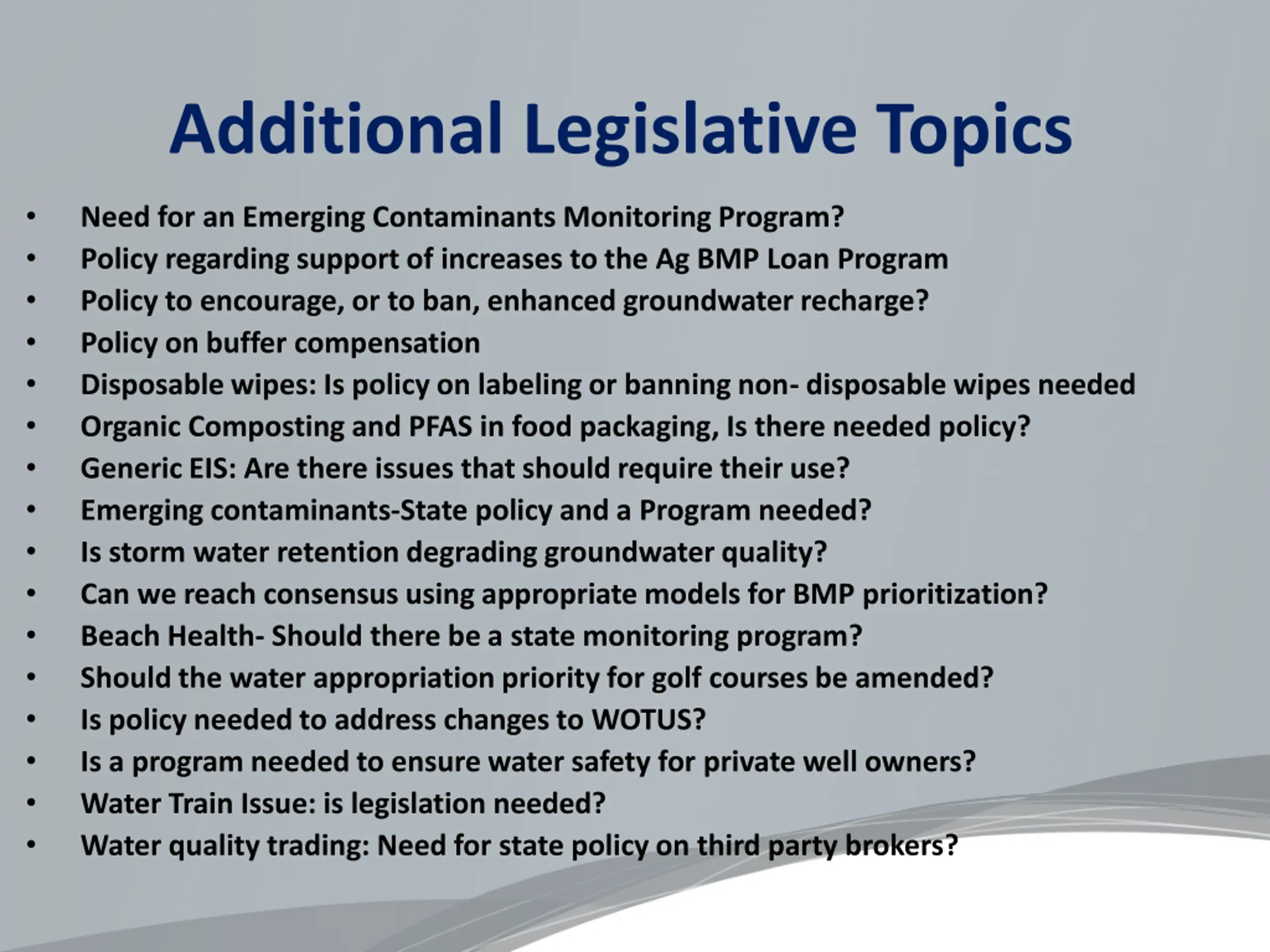 Additional Legislative Topics Need for an Emerging Contaminants Monitoring Program? Policy regarding support of increases to the Ag BMP Loan Program Policy to encourage, or to ban, enhanced groundwater recharge? Policy on buffer compensation Disposable wipes: Is policy on labeling or banning non- disposable wipes needed Organic Composting and PFAS in food packaging, Is there needed policy? Generic EIS: Are there issues that should require their use? Emerging contaminants-State policy and a Program needed? Is storm water retention degrading groundwater quality? Can we reach consensus using appropriate models for BMP prioritization? Beach Health- Should there be a state monitoring program? Should the water appropriation priority for golf courses be amended? Is policy needed to address changes to WOTUS? Is a program needed to ensure water safety for private well owners? Water Train Issue: is legislation needed? Water quality trading: Need for state policy on third party brokers?