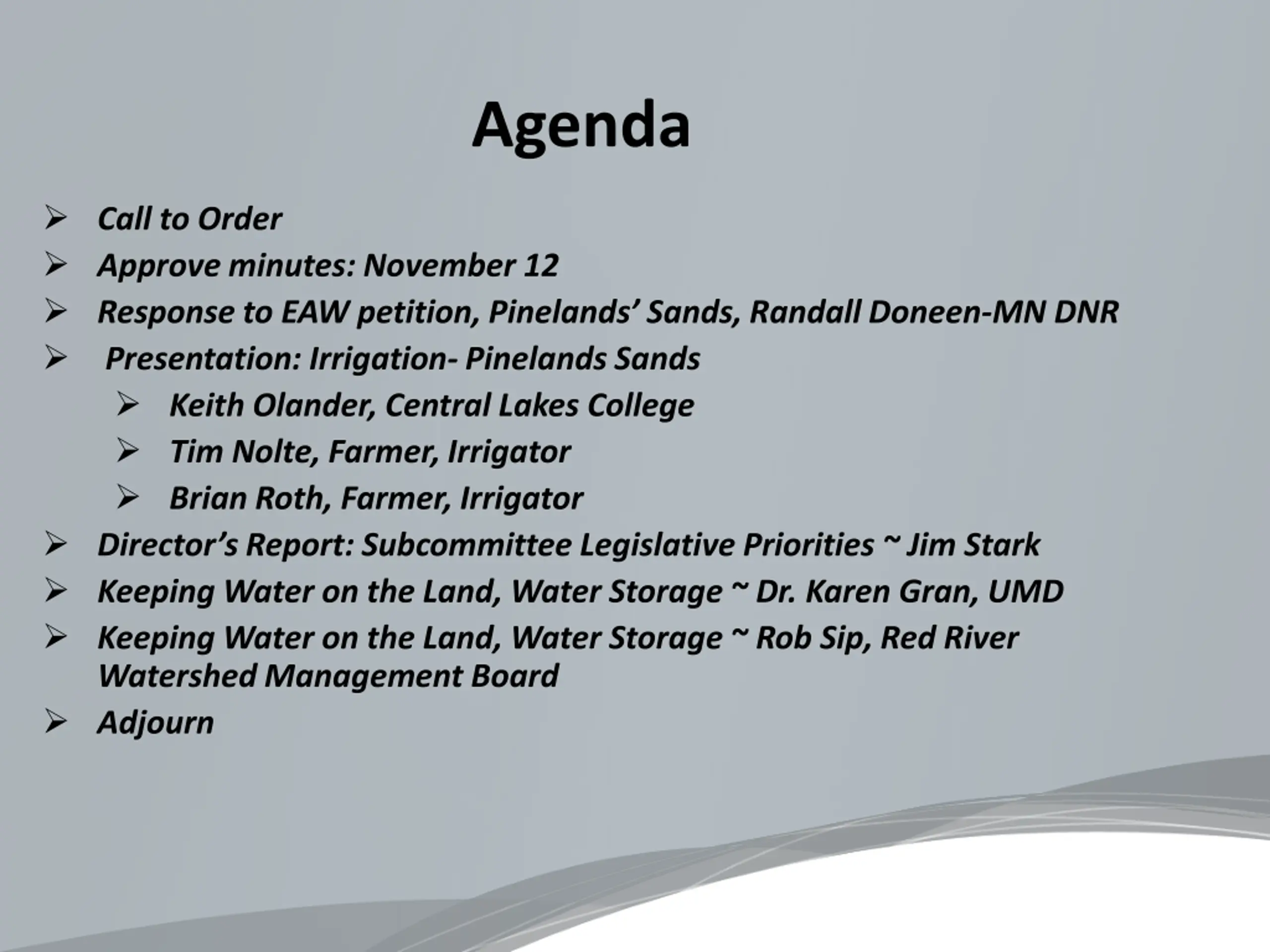 Agenda Call to Order Approve minutes: November 12 Response to EAW petition, Pinelands Sands, Randall Doneen-MN DNR Presentation: Irrigation- Pinelands Sands Keith Olander, Central Lakes College Tim Nolte, Farmer, Irrigator Brian Roth, Farmer, Irrigator Director s Report: Subcommittee Legislative Priorities ~ Jim Stark Keeping Water on the Land, Water Storage ~ Dr. Karen Gran, UMD Keeping Water on the Land, Water Storage ~ Rob Sip, Red River Watershed Management Board Adjourn
