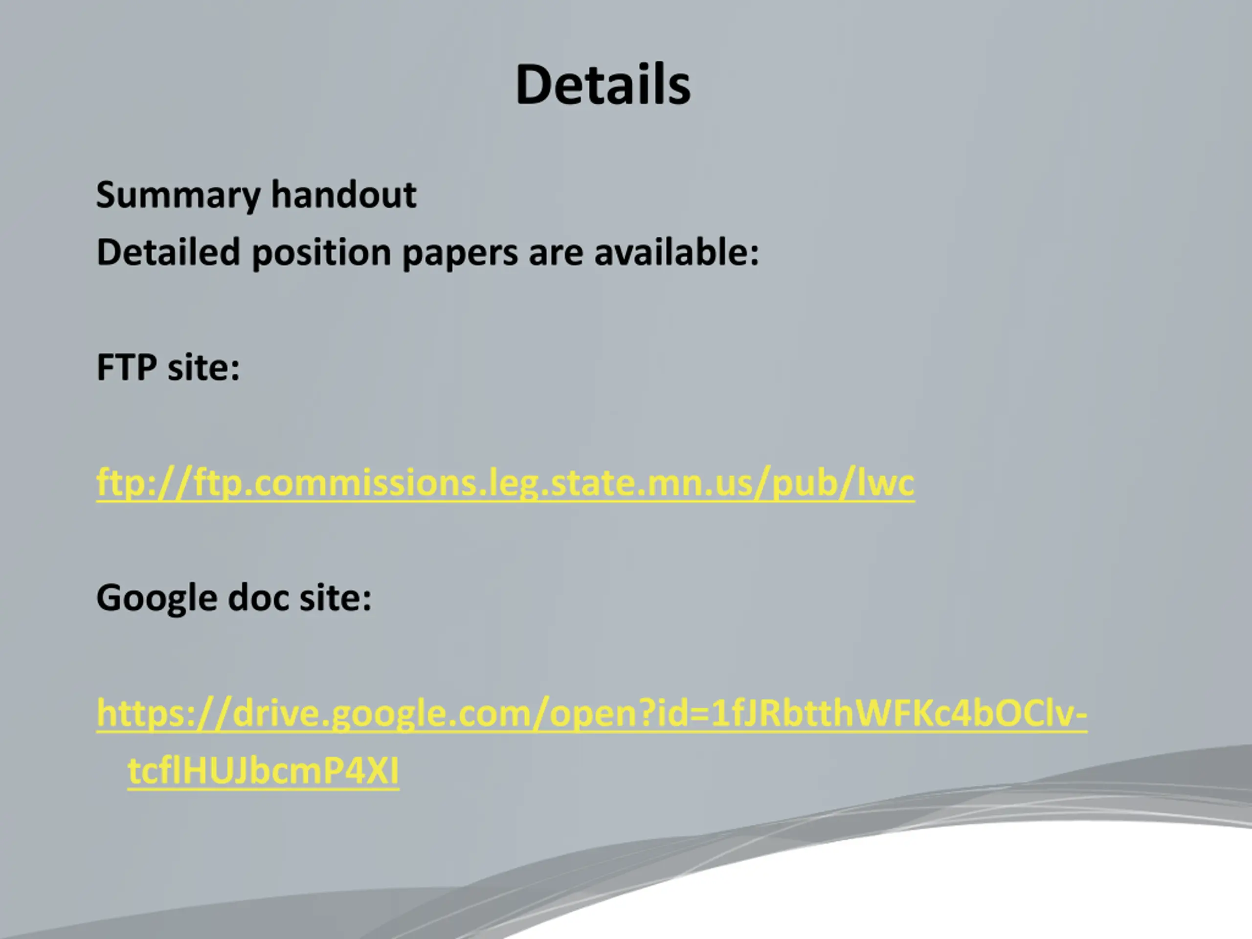 Details Summary handout Detailed position papers are available: FTP site: ftp://ftp.commissions.leg.state.mn.us/pub/lwc Google doc site: https://drive.google.com/open?id=1fJRbtthWFKc4bOClv- tcflHUJbcmP4XI
