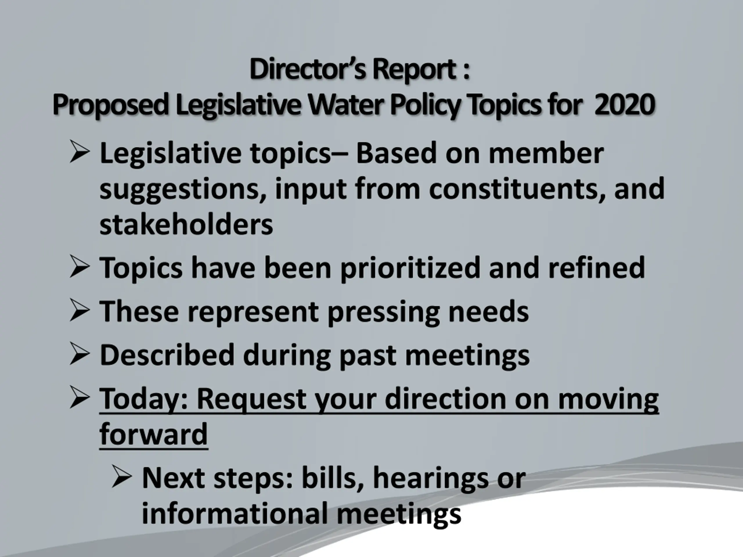 Directors Report : Proposed Legislative Water Policy Topics for 2020 Legislative topics Based on member suggestions, input from constituents, and stakeholders Topics have been prioritized and refined These represent pressing needs Described during past meetings Today: Request your direction on moving forward Next steps: bills, hearings or informational meetings