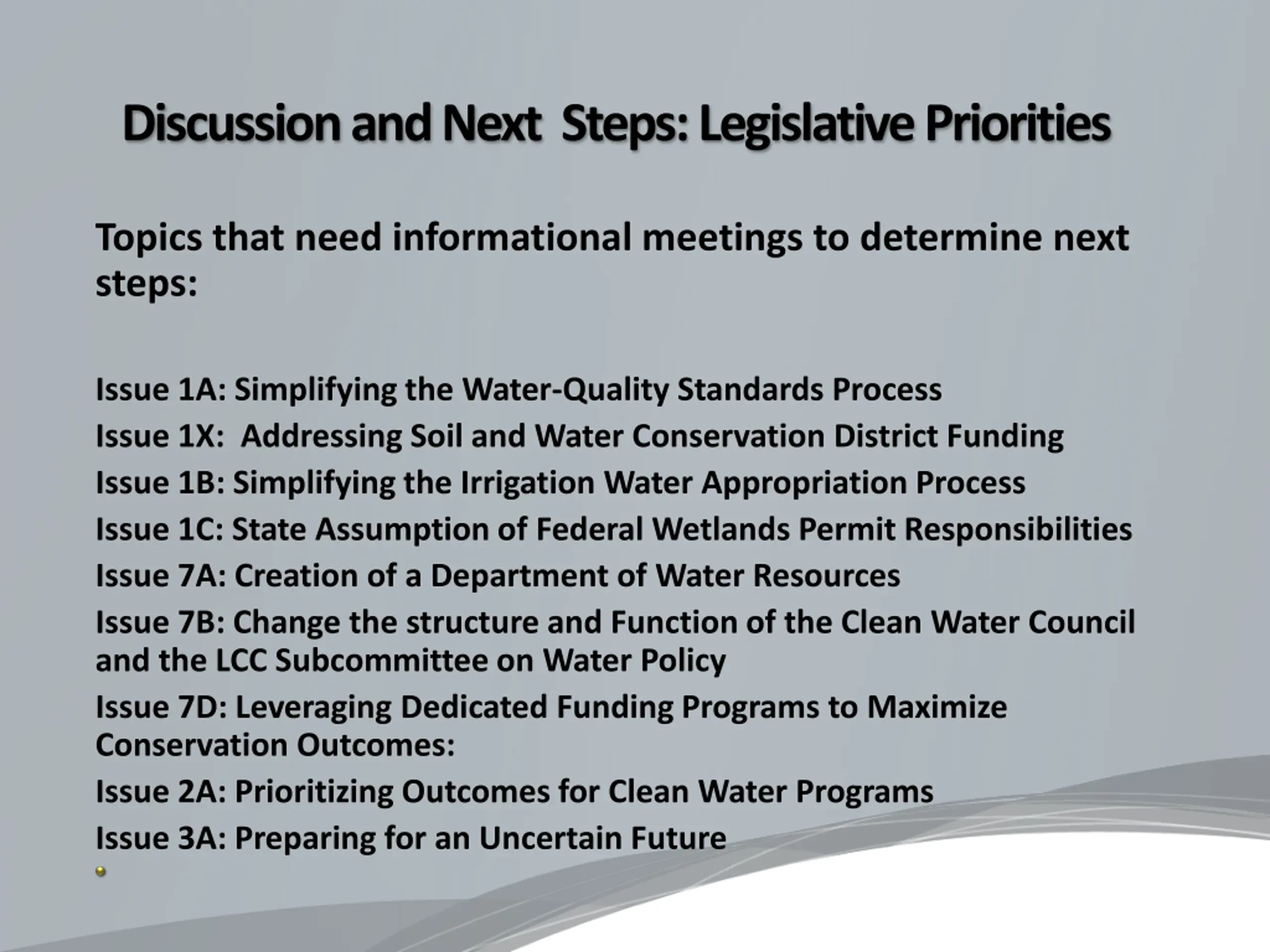 Discussion and Next Steps: Legislative Priorities Topics that need informational meetings to determine next steps: Issue 1A: Simplifying the Water-Quality Standards Process Issue 1X: Addressing Soil and Water Conservation District Funding Issue 1B: Simplifying the Irrigation Water Appropriation Process Issue 1C: State Assumption of Federal Wetlands Permit Responsibilities Issue 7A: Creation of a Department of Water Resources Issue 7B: Change the structure and Function of the Clean Water Council and the LCC Subcommittee on Water Policy Issue 7D: Leveraging Dedicated Funding Programs to Maximize Conservation Outcomes: Issue 2A: Prioritizing Outcomes for Clean Water Programs Issue 3A: Preparing for an Uncertain Future