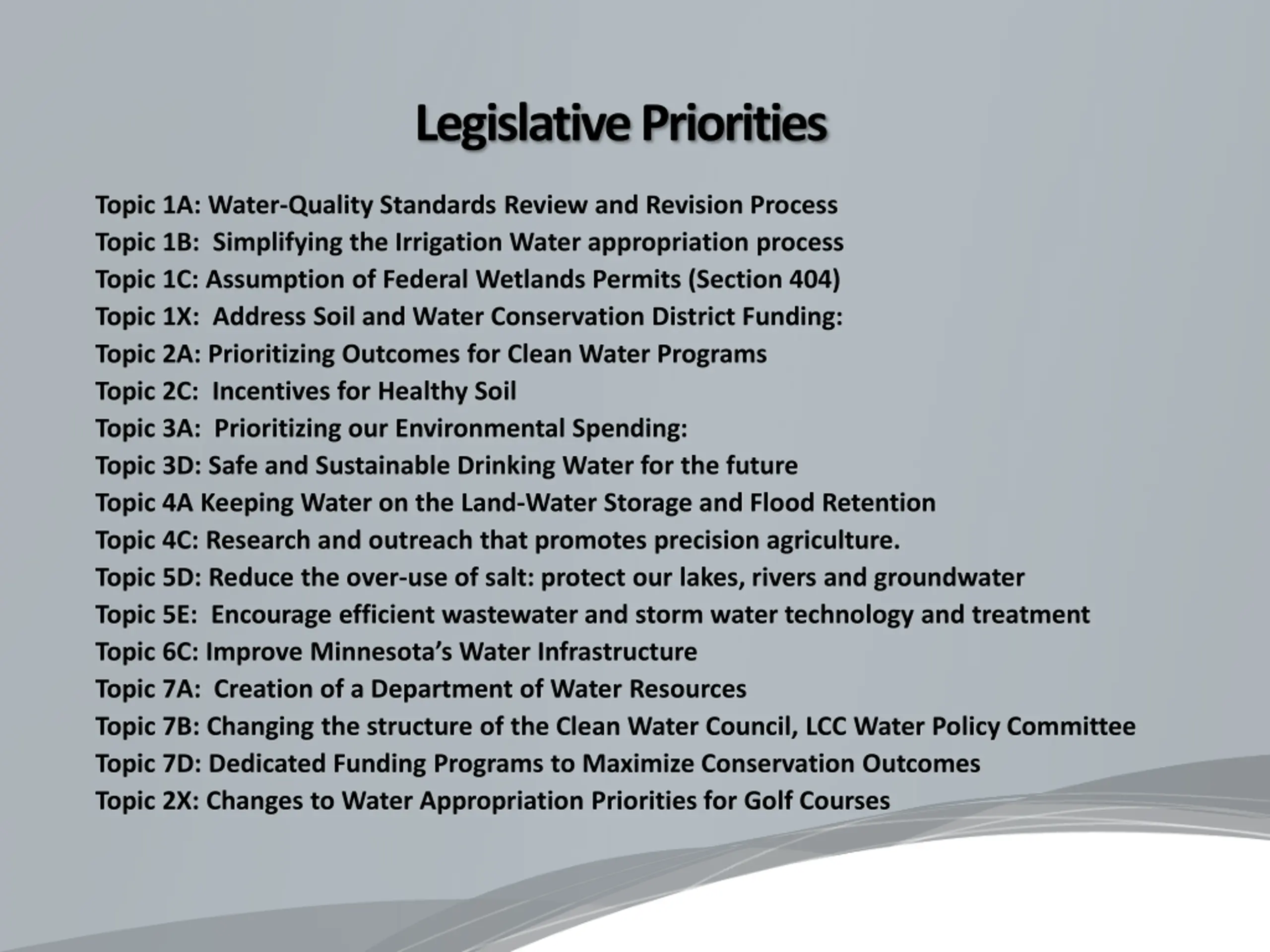 Discussion and Next Steps: Legislative Priorities Topic 1A: Water-Quality Standards Review and Revision Process Topic 1B: Simplifying the Irrigation Water appropriation process Topic 1C: Assumption of Federal Wetlands Permits (Section 404) Topic 1X: Address Soil and Water Conservation District Funding: Topic 2A: Prioritizing Outcomes for Clean Water Programs Topic 2C: Incentives for Healthy Soil Topic 3A: Prioritizing our Environmental Spending: Topic 3D: Safe and Sustainable Drinking Water for the future Topic 4A Keeping Water on the Land-Water Storage and Flood Retention Topic 4C: Research and outreach that promotes precision agriculture. Topic 5D: Reduce the over-use of salt: protect our lakes, rivers and groundwater Topic 5E: Encourage efficient wastewater and storm water technology and treatment Topic 6C: Improve Minnesota s Water Infrastructure Topic 7A: Creation of a Department of Water Resources Topic 7B: Changing the structure of the Clean Water Council, LCC Water Policy Committee Topic 7D: Dedicated Funding Programs to Maximize Conservation Outcomes Topic 2X: Changes to Water Appropriation Priorities for Golf Courses