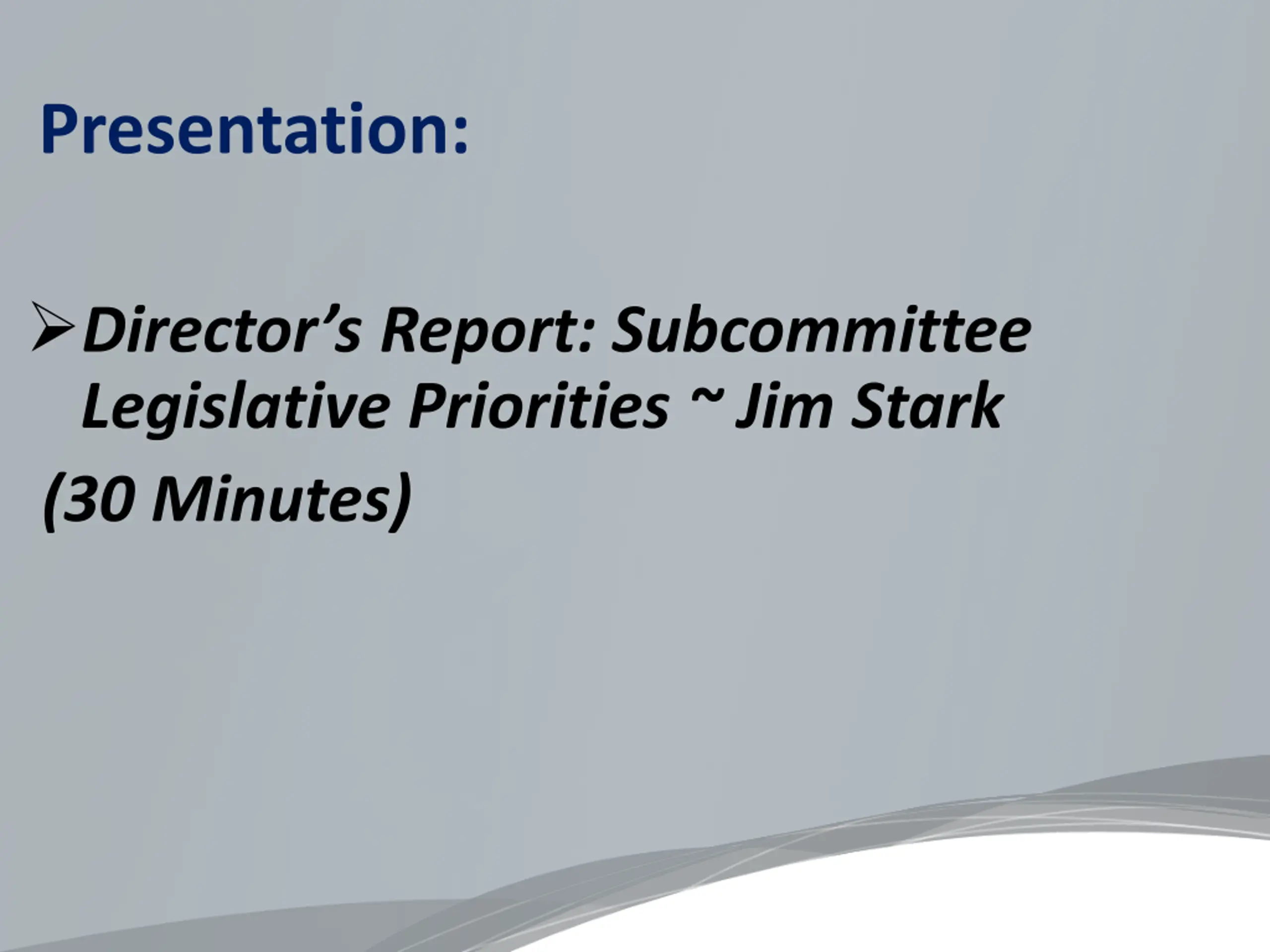 Presentation: Director s Report: Subcommittee Legislative Priorities ~ Jim Stark (30 Minutes)
