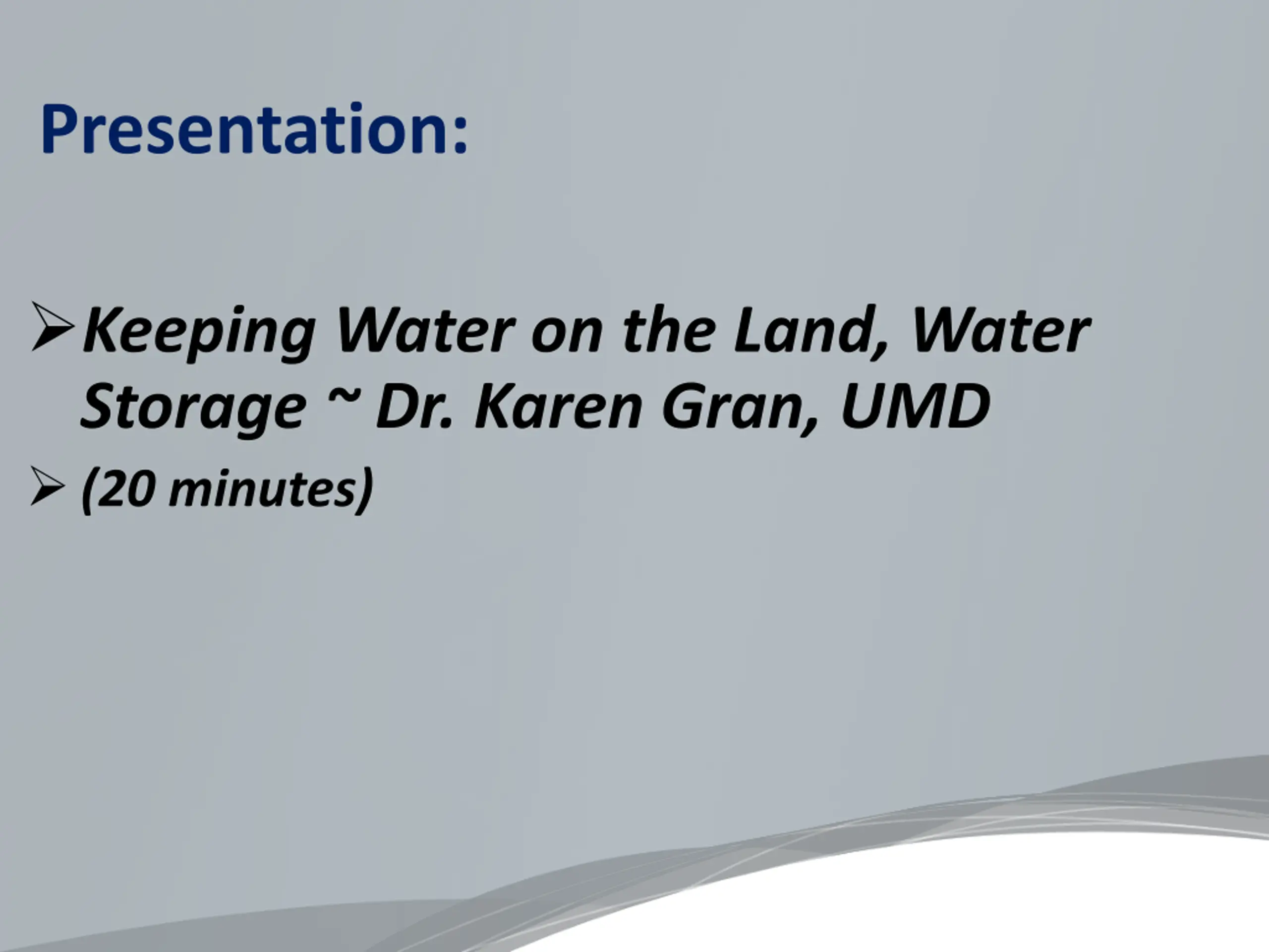 Presentation: Keeping Water on the Land, Water Storage ~ Dr. Karen Gran, UMD (20 minutes)