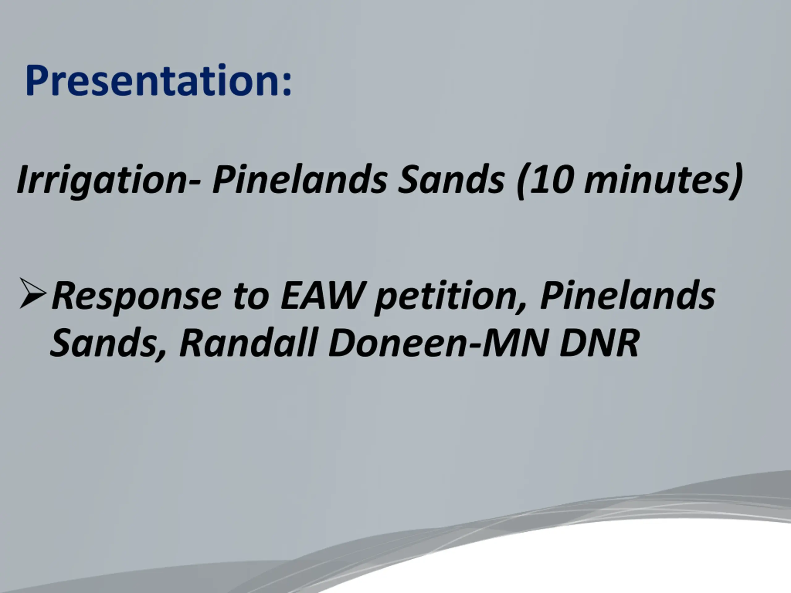 Presentation: Irrigation- Pinelands Sands (10 minutes) Response to EAW petition, Pinelands Sands, Randall Doneen-MN DNR