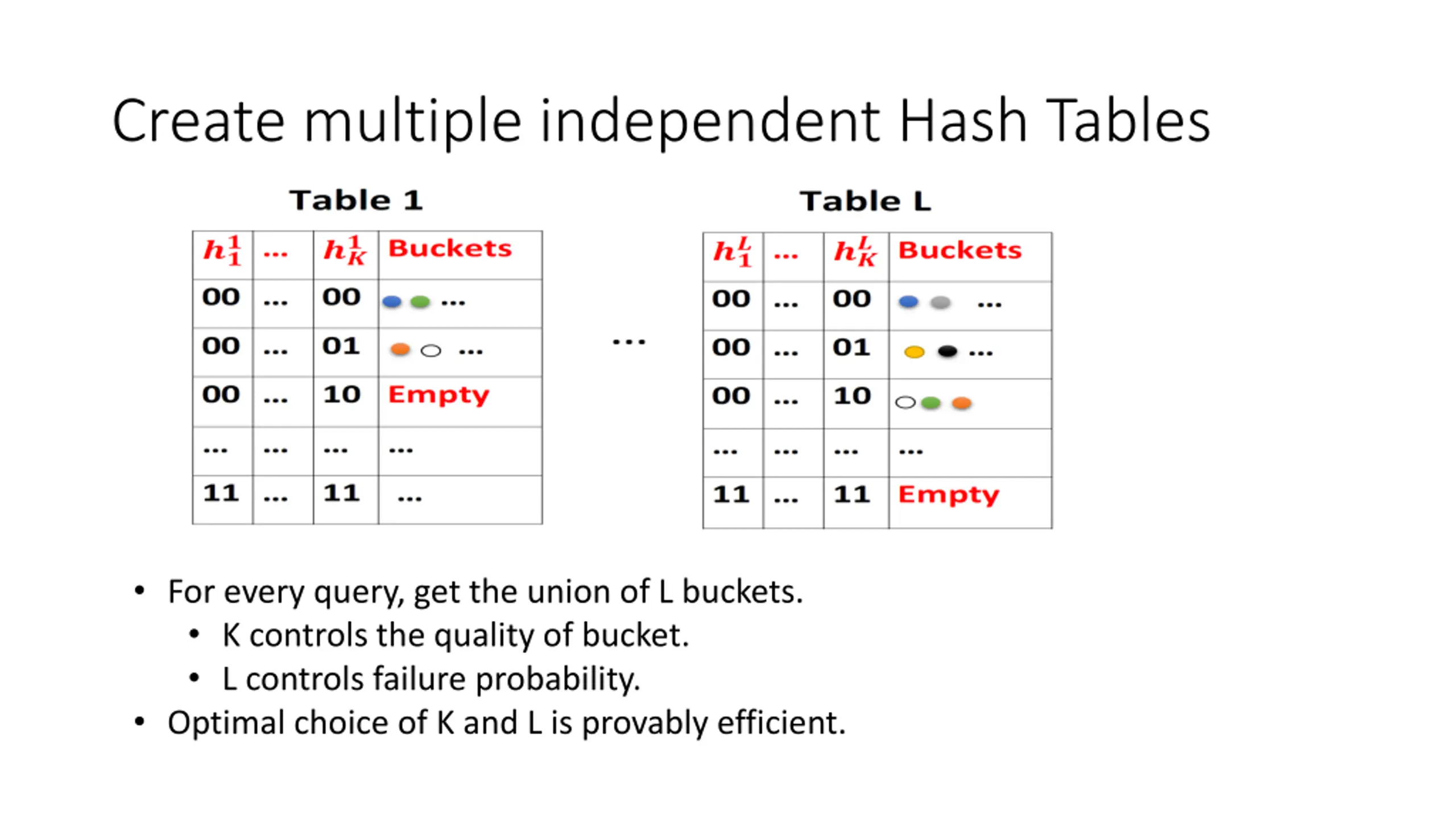 Create multiple independent Hash Tables For every query, get the union of L buckets. K controls the quality of bucket. L controls failure probability. Optimal choice of K and L is provably efficient.