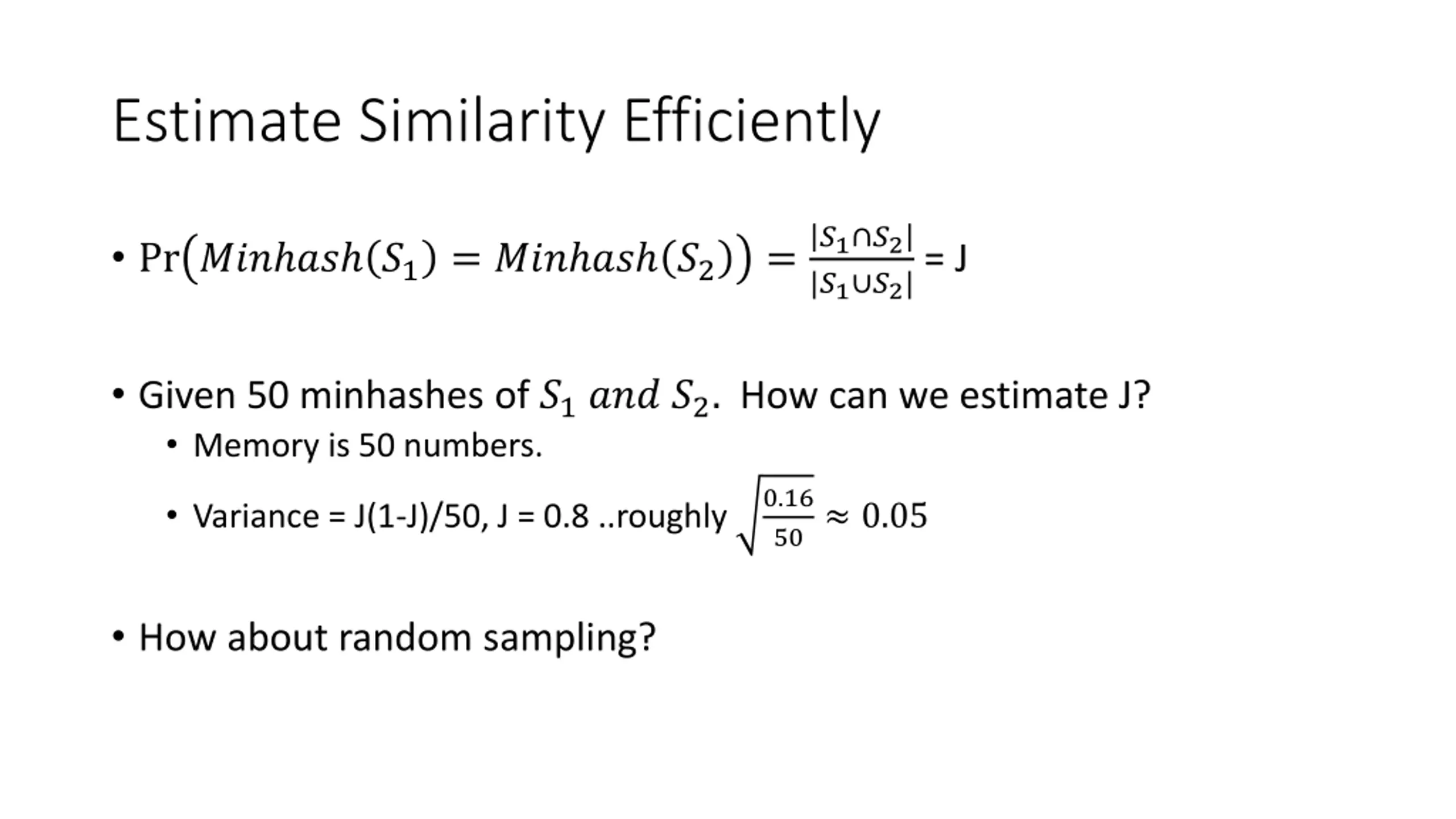 Estimate Similarity Efficiently ?1 ?2 |?1 ?2| = J Pr ??? ?? ?1 = ??? ?? ?2 = Given 50 minhashes of ?1 ??? ?2. How can we estimate J? Memory is 50 numbers. 0.16 50 0.05 Variance = J(1-J)/50, J = 0.8 ..roughly How about random sampling?