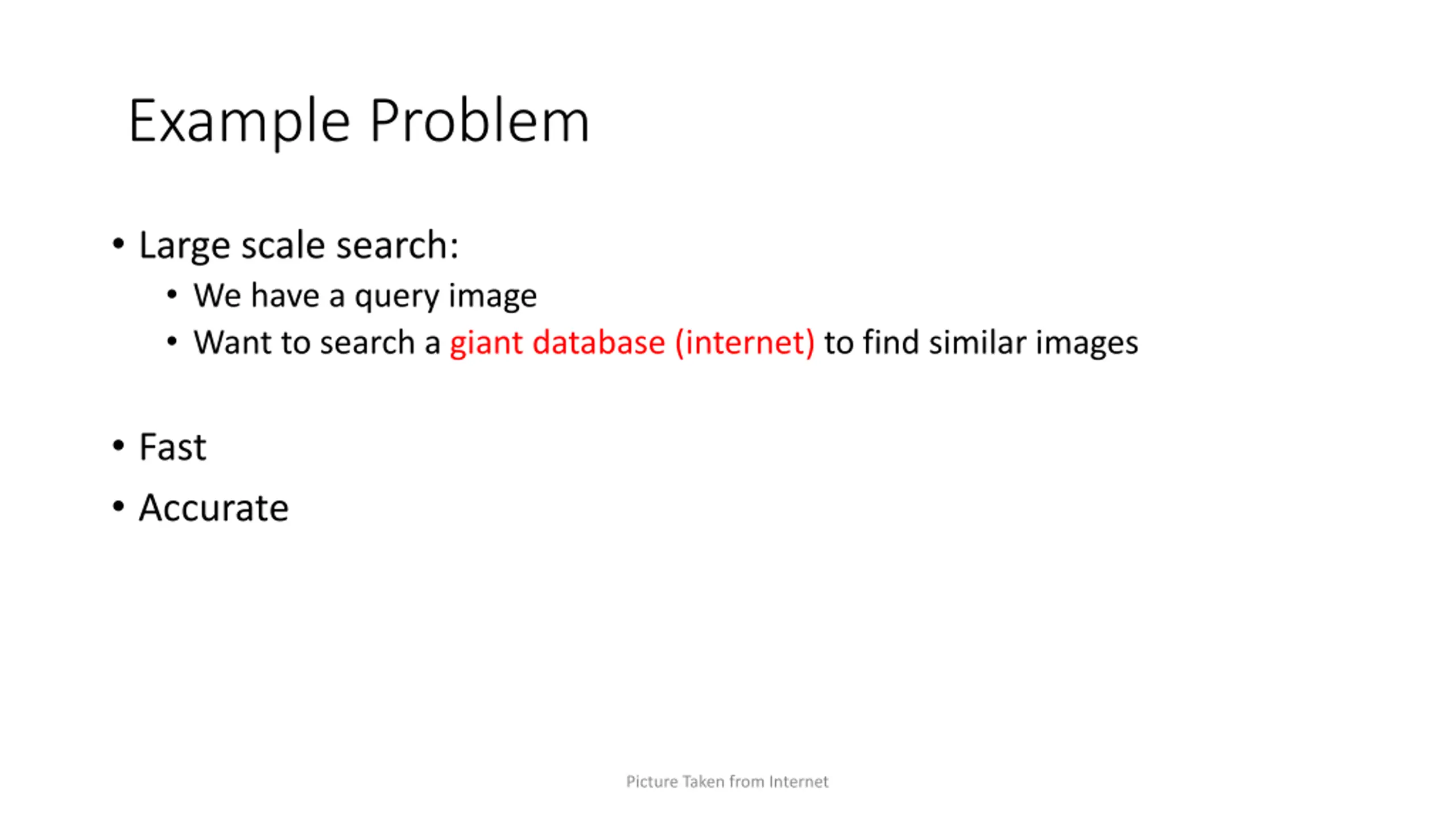 Example Problem Large scale search: We have a query image Want to search a giant database (internet) to find similar images Fast Accurate Picture Taken from Internet