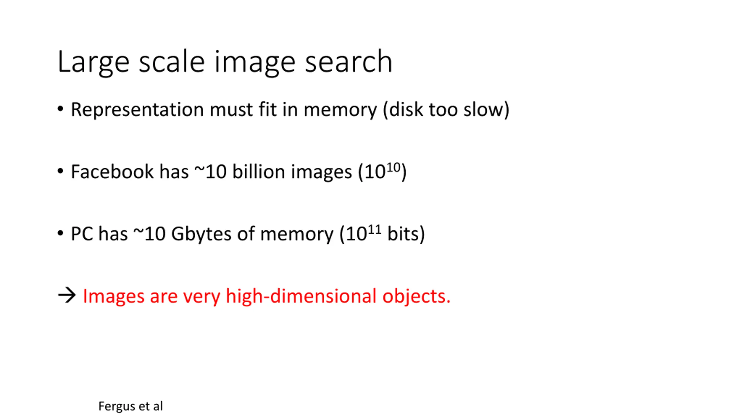 Large scale image search Representation must fit in memory (disk too slow) Facebook has ~10 billion images (1010) PC has ~10 Gbytes of memory (1011 bits) Images are very high-dimensional objects. Fergus et al