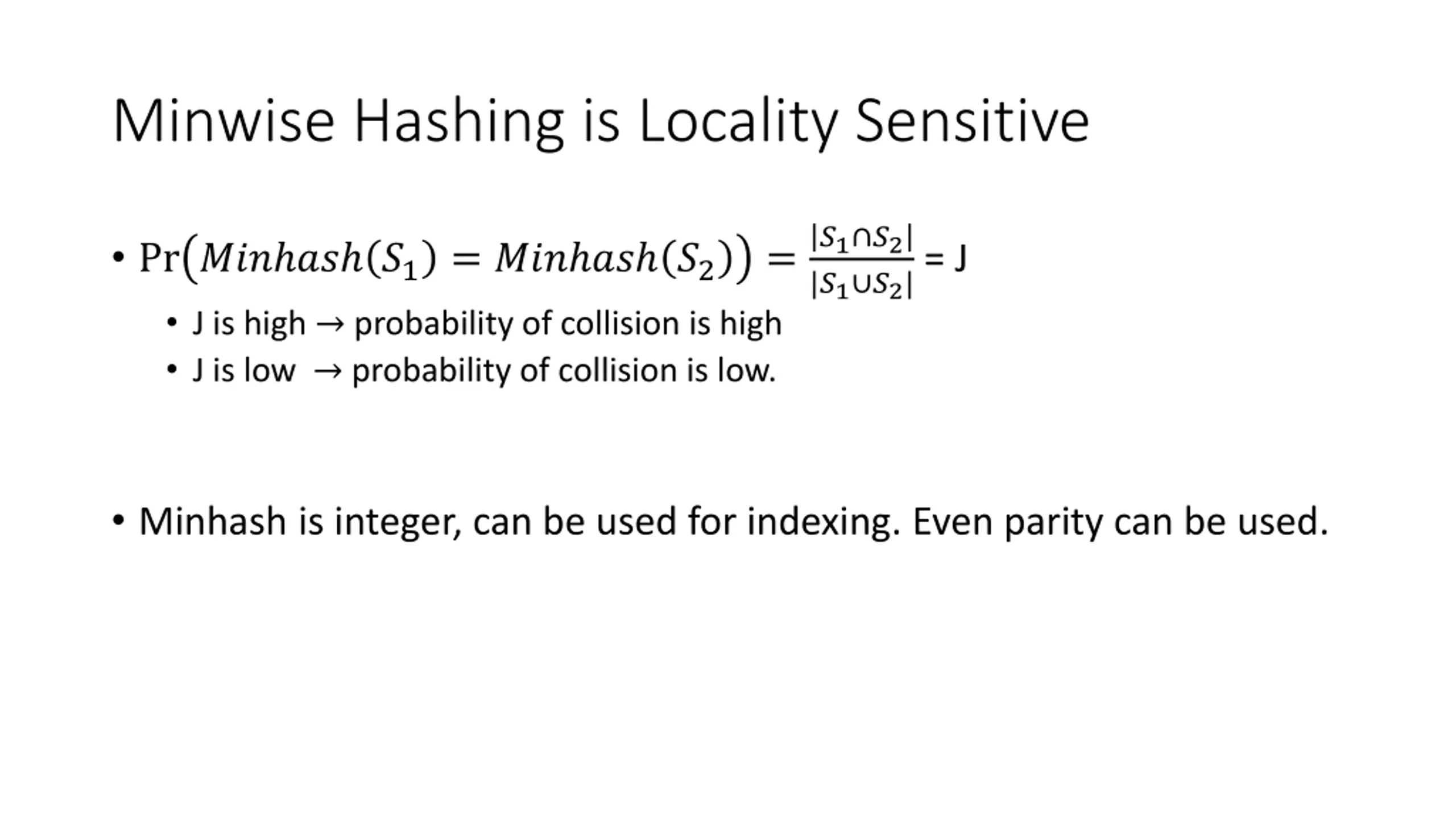 Minwise Hashing is Locality Sensitive ?1 ?2 |?1 ?2| = J Pr ??? ?? ?1 = ??? ?? ?2 J is high probability of collision is high J is low probability of collision is low. = Minhash is integer, can be used for indexing. Even parity can be used.