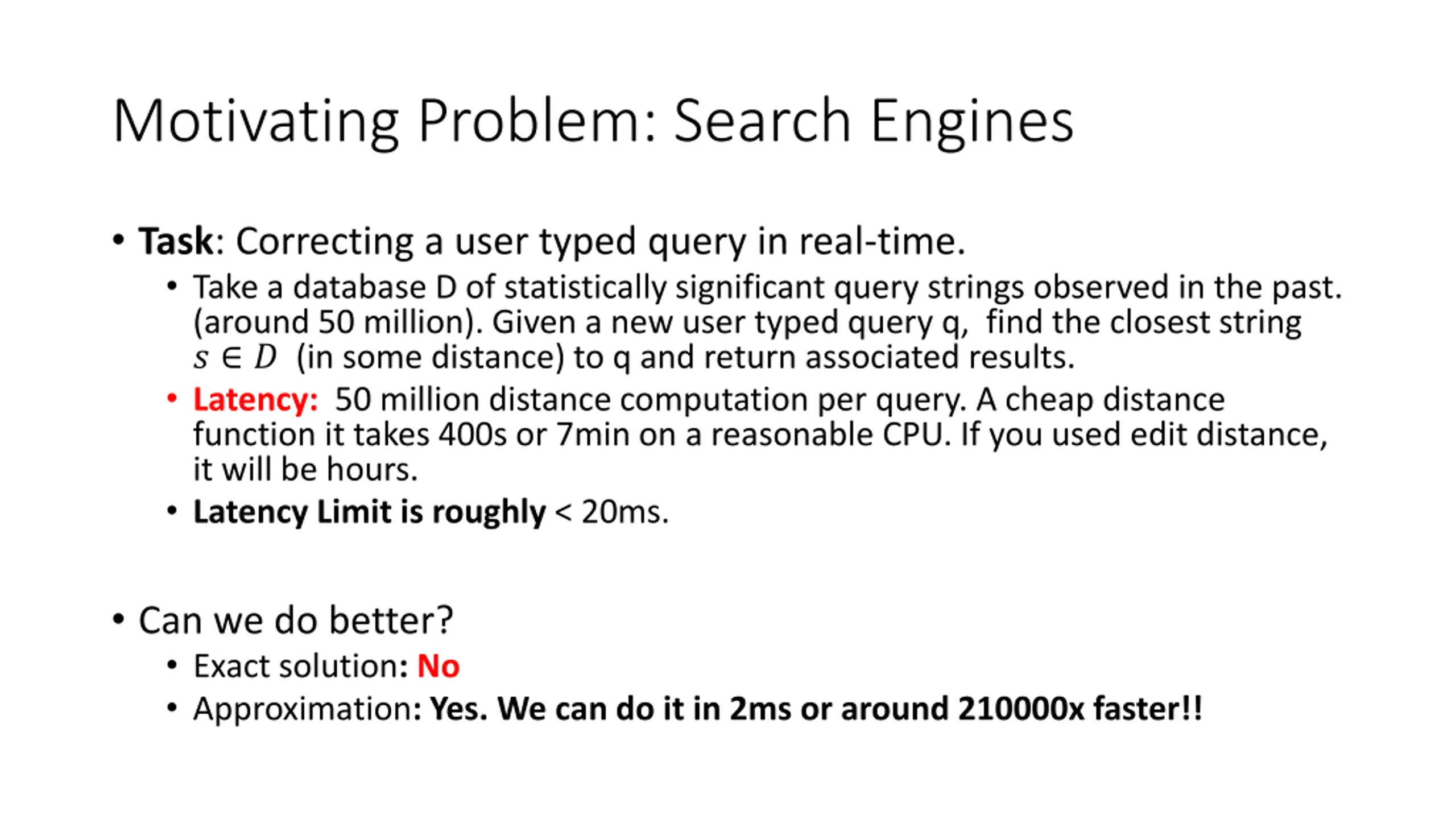 Motivating Problem: Search Engines Task: Correcting a user typed query in real-time. Take a database D of statistically significant query strings observed in the past. (around 50 million). Given a new user typed query q, find the closest string ? ? (in some distance) to q and return associated results. Latency: 50 million distance computation per query. A cheap distance function it takes 400s or 7min on a reasonable CPU. If you used edit distance, it will be hours. Latency Limit is roughly < 20ms. Can we do better? Exact solution: No Approximation: Yes. We can do it in 2ms or around 210000x faster!!