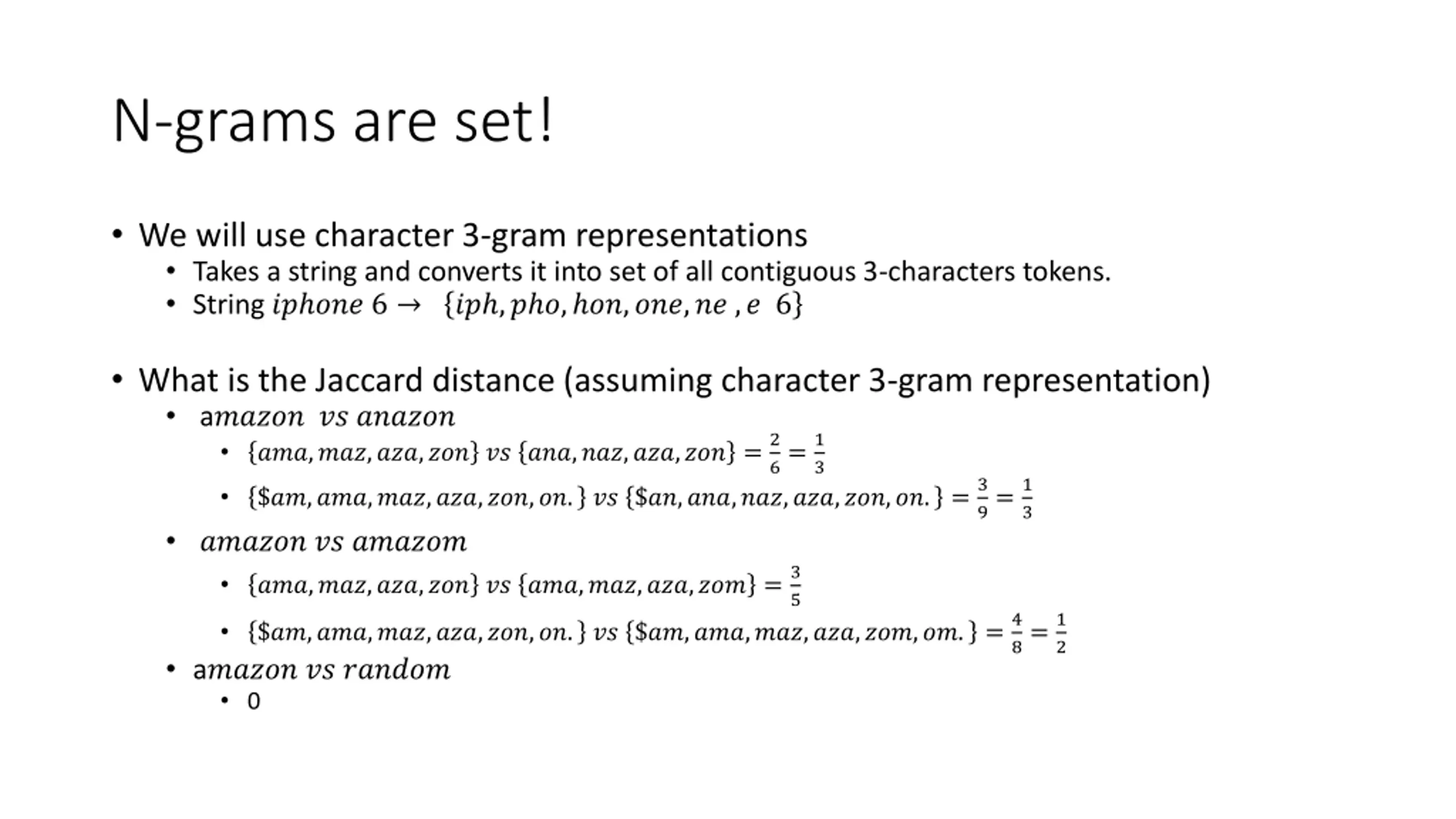 N-grams are set! We will use character 3-gram representations Takes a string and converts it into set of all contiguous 3-characters tokens. String ?? ??? 6 ?? ,? ?, ??,???,?? ,? 6 What is the Jaccard distance (assuming character 3-gram representation) a????? ?? ?????? ???,???,???,??? ?? ???,???,???,??? =2 $??,???,???,???,???,??. ?? $??,???,???,???,???,??. =3 ?????? ?? ?????? ???,???,???,??? ?? ???,???,???,??? =3 $??,???,???,???,???,??. ?? $??,???,???,???,???,??. =4 a????? ?? ?????? 0 6=1 3 9=1 3 5 8=1 2