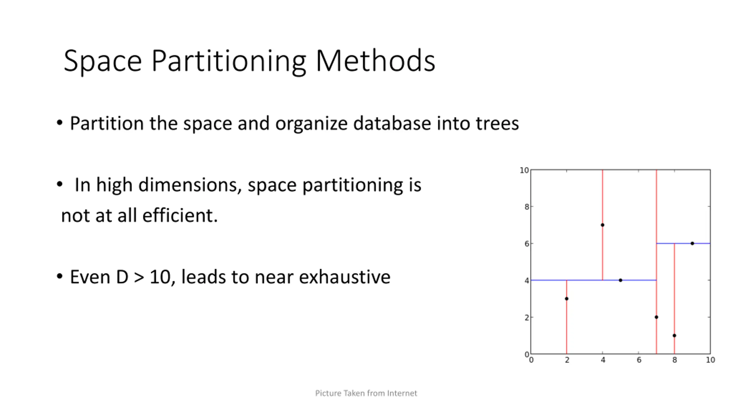 Space Partitioning Methods Partition the space and organize database into trees In high dimensions, space partitioning is not at all efficient. Even D > 10, leads to near exhaustive Picture Taken from Internet