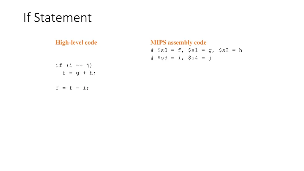 If Statement High-level code MIPS assembly code # $s0 = f, $s1 = g, $s2 = h # $s3 = i, $s4 = j if (i == j) f = g + h; f = f i;