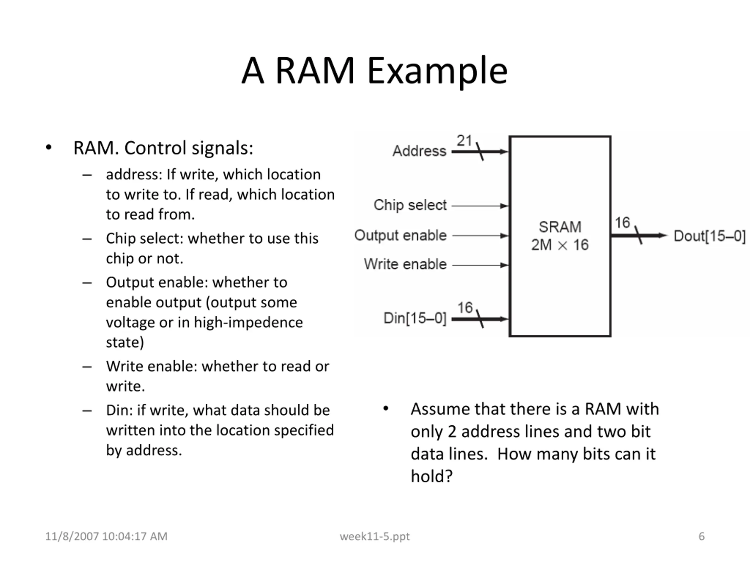 A RAM Example RAM. Control signals: address: If write, which location to write to. If read, which location to read from. Chip select: whether to use this chip or not. Output enable: whether to enable output (output some voltage or in high-impedence state) Write enable: whether to read or write. Din: if write, what data should be written into the location specified by address. Assume that there is a RAM with only 2 address lines and two bit data lines. How many bits can it hold? 11/8/2007 10:04:17 AM week11-5.ppt 6