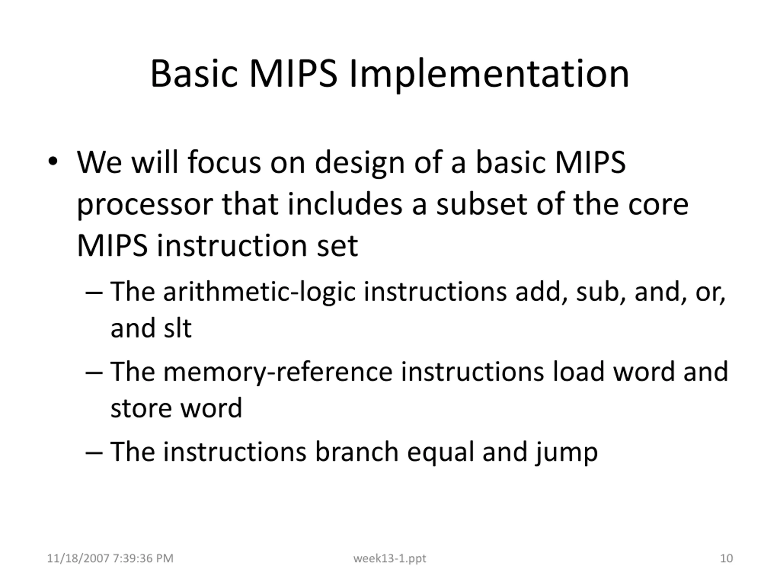Basic MIPS Implementation We will focus on design of a basic MIPS processor that includes a subset of the core MIPS instruction set The arithmetic-logic instructions add, sub, and, or, and slt The memory-reference instructions load word and store word The instructions branch equal and jump 11/18/2007 7:39:36 PM week13-1.ppt 10