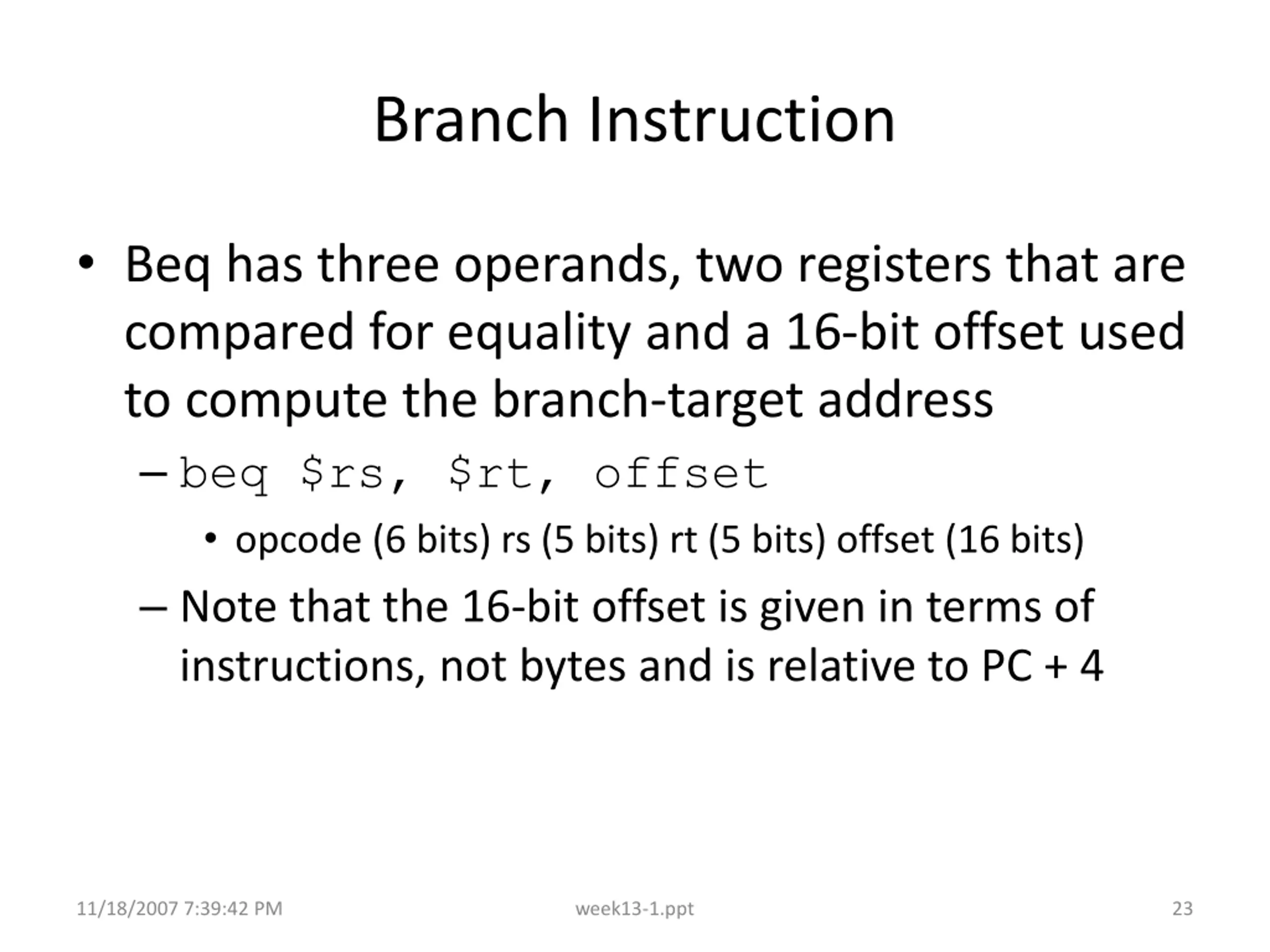 Branch Instruction Beq has three operands, two registers that are compared for equality and a 16-bit offset used to compute the branch-target address beq $rs, $rt, offset opcode (6 bits) rs (5 bits) rt (5 bits) offset (16 bits) Note that the 16-bit offset is given in terms of instructions, not bytes and is relative to PC + 4 11/18/2007 7:39:42 PM week13-1.ppt 23