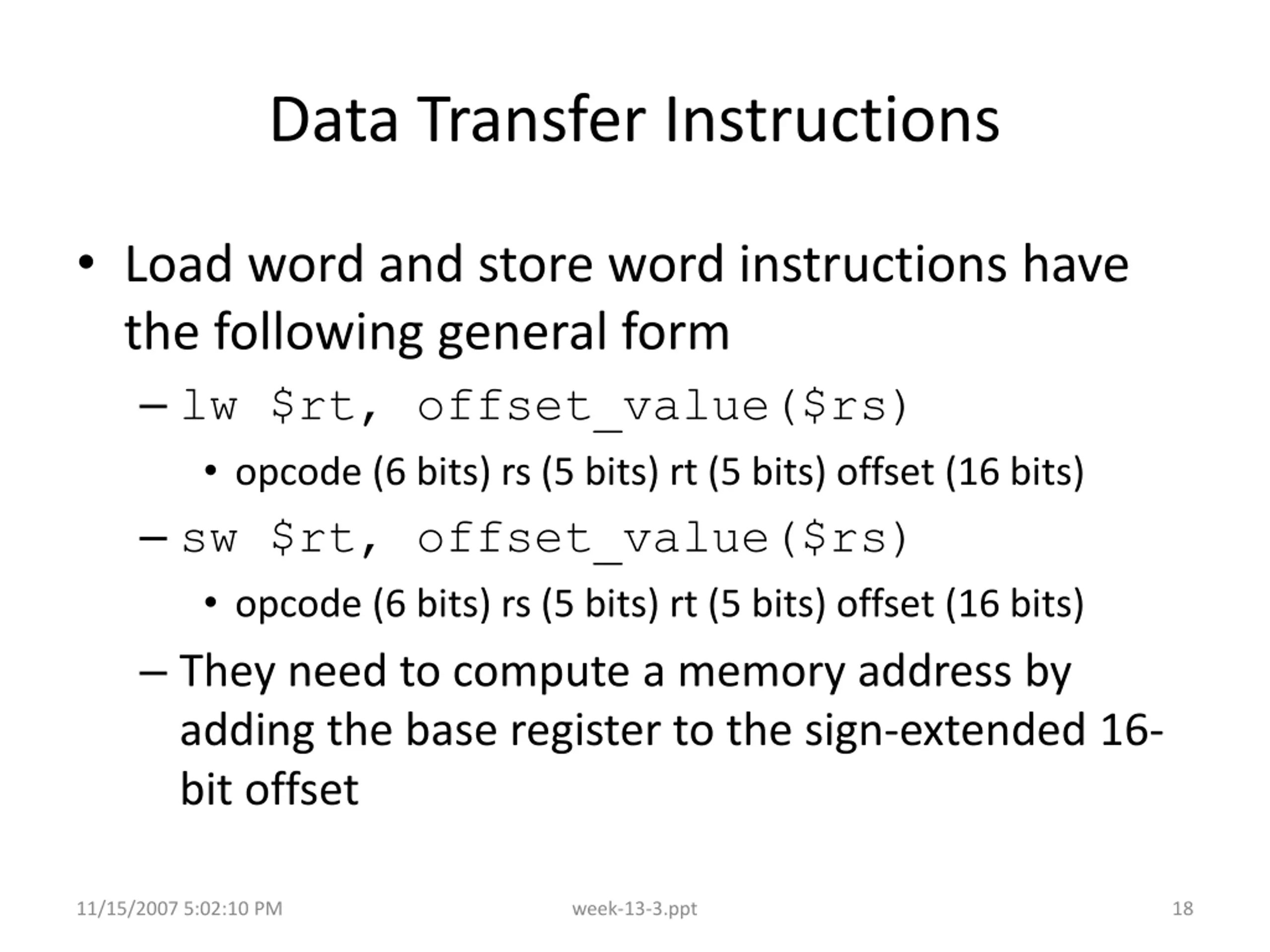 Data Transfer Instructions Load word and store word instructions have the following general form lw $rt, offset_value($rs) opcode (6 bits) rs (5 bits) rt (5 bits) offset (16 bits) sw $rt, offset_value($rs) opcode (6 bits) rs (5 bits) rt (5 bits) offset (16 bits) They need to compute a memory address by adding the base register to the sign-extended 16- bit offset 11/15/2007 5:02:10 PM week-13-3.ppt 18