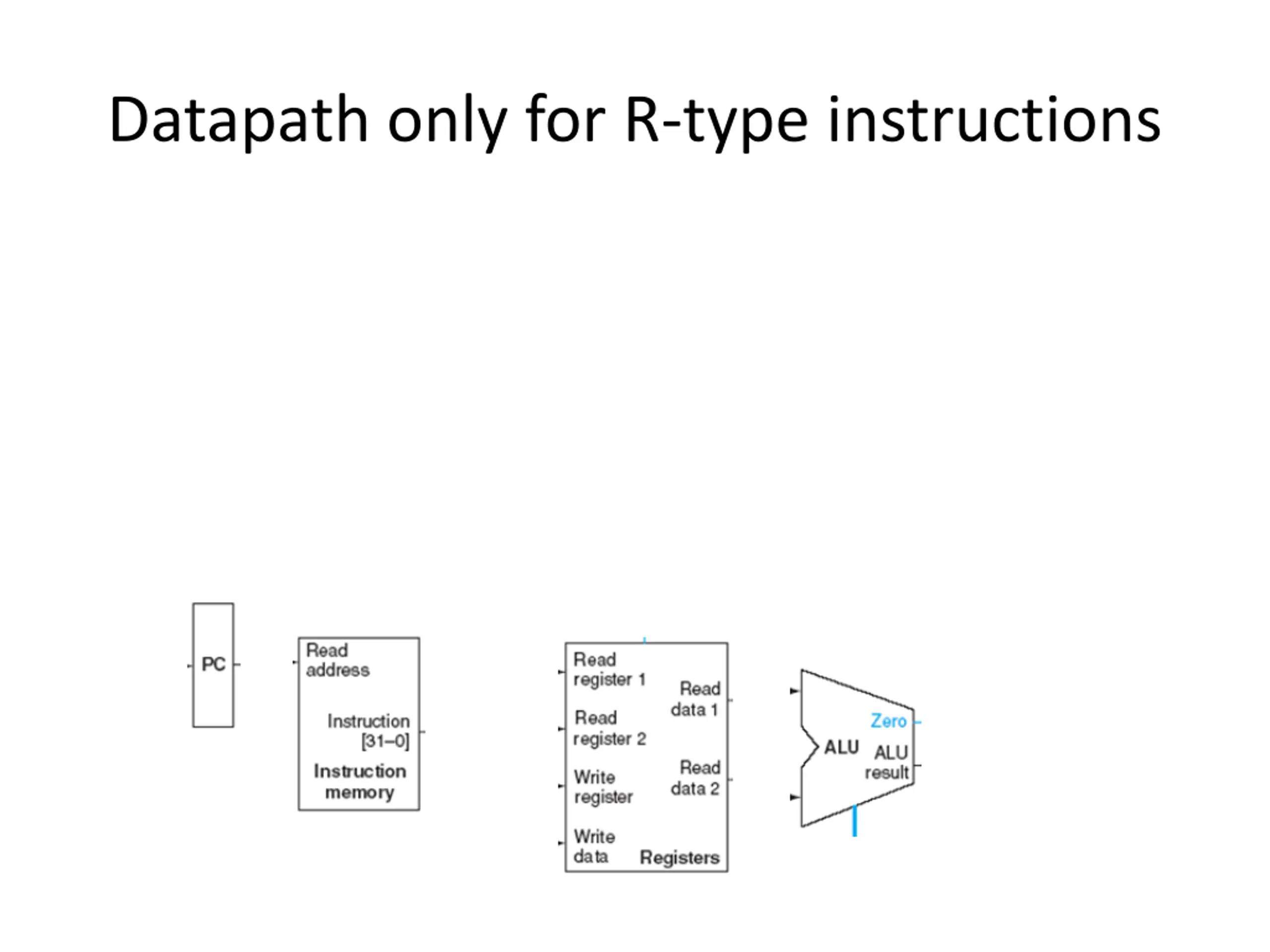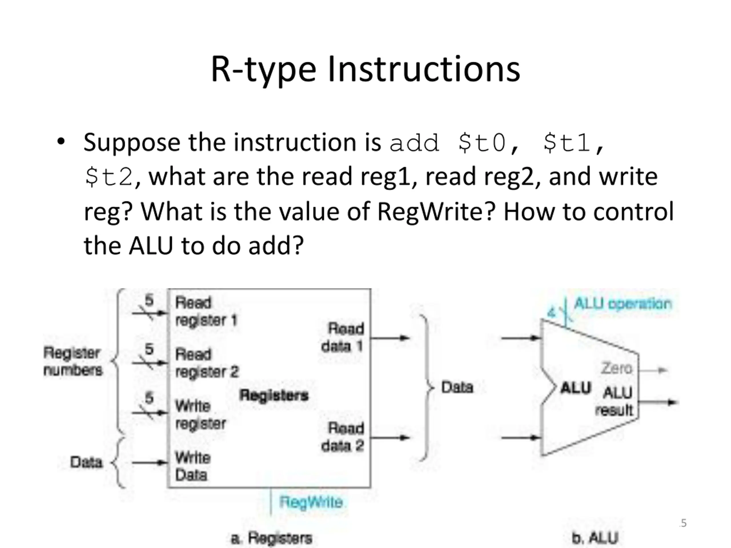 R-type Instructions Suppose the instruction is add $t0, $t1, $t2, what are the read reg1, read reg2, and write reg? What is the value of RegWrite? How to control the ALU to do add? 11/15/2007 5:02:08 PM week-13-3.ppt 15