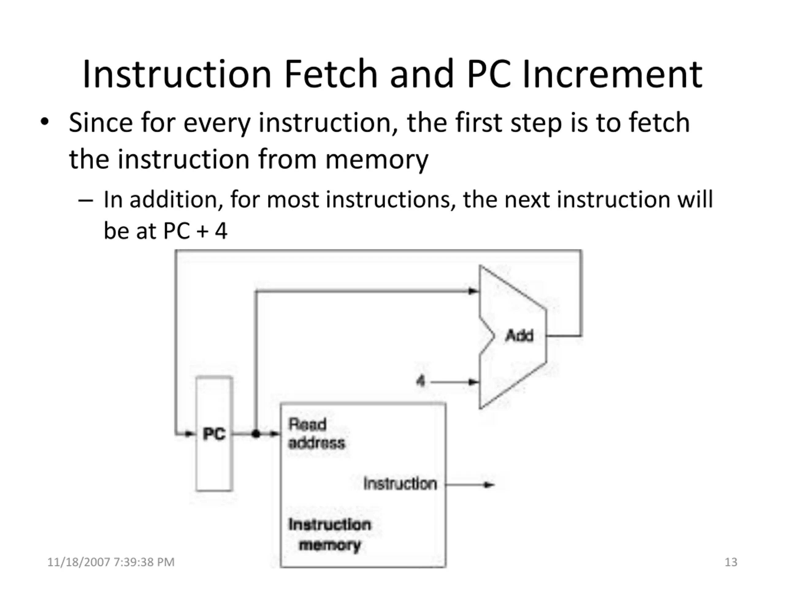 Instruction Fetch and PC Increment Since for every instruction, the first step is to fetch the instruction from memory In addition, for most instructions, the next instruction will be at PC + 4 11/18/2007 7:39:38 PM week13-1.ppt 13
