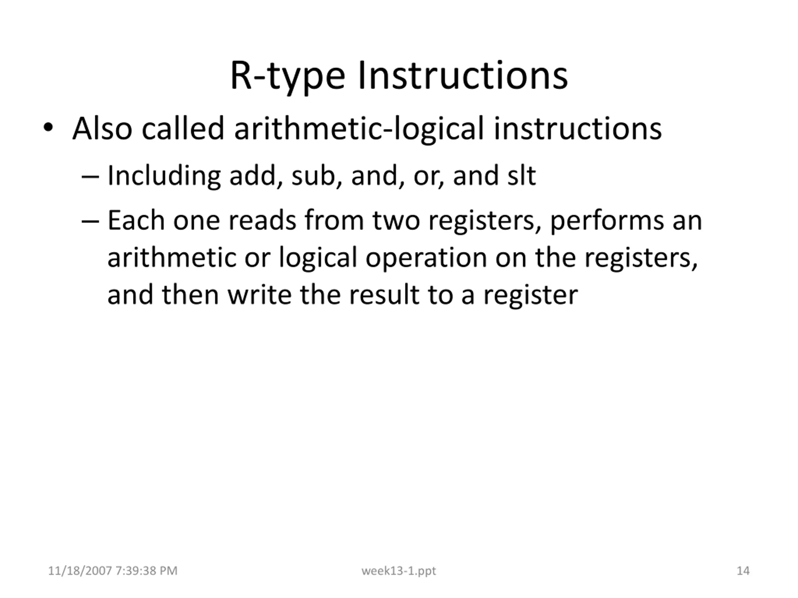 R-type Instructions Also called arithmetic-logical instructions Including add, sub, and, or, and slt Each one reads from two registers, performs an arithmetic or logical operation on the registers, and then write the result to a register 11/18/2007 7:39:38 PM week13-1.ppt 14